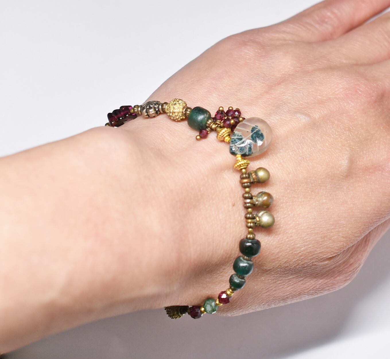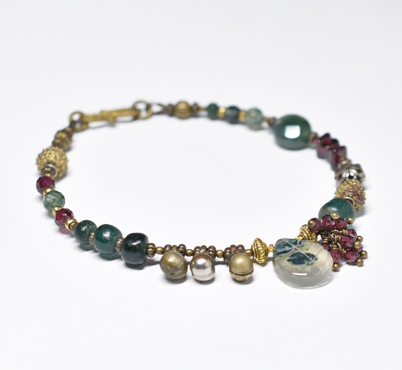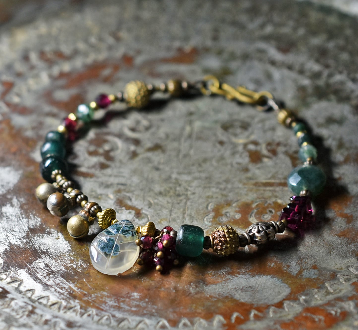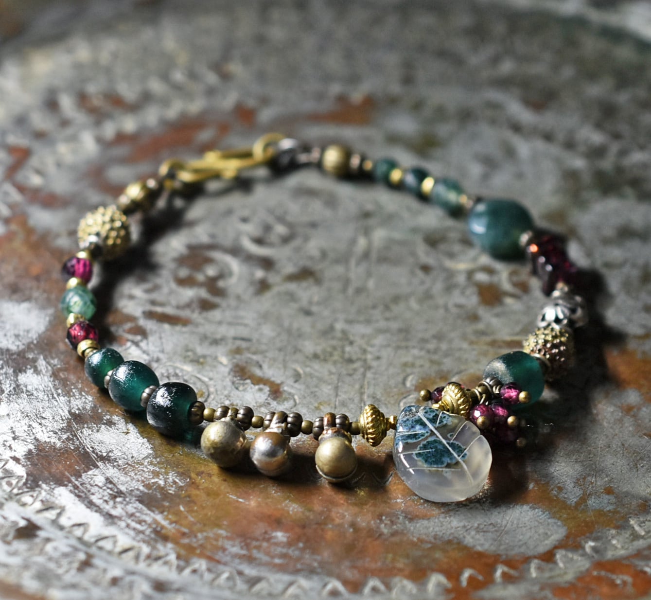 モスアゲートとガーネット、ブラスビーズ、インドシルバー、グリーンブルービーズ、民族鈴のブレス