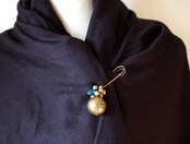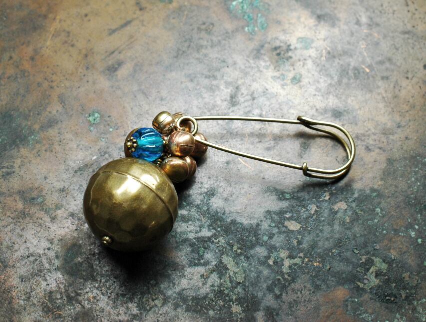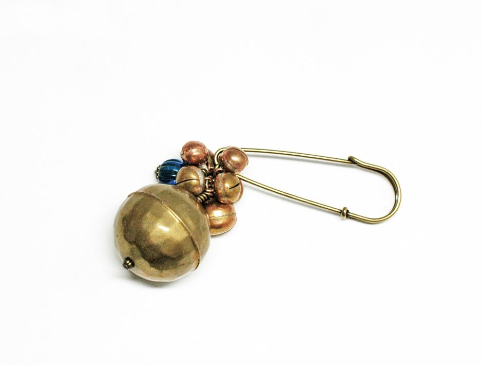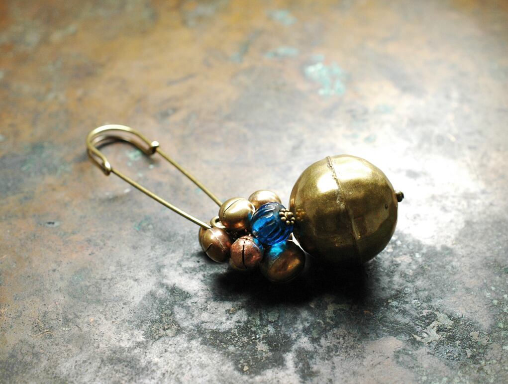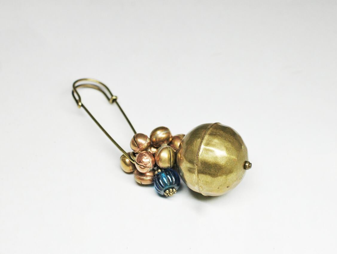 ヴィンテージのブラスビーズと、たわわな鈴、蜜柑玉のガラスビーズを繋げたブローチピンです。