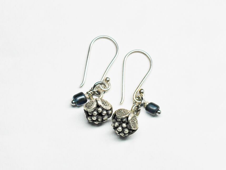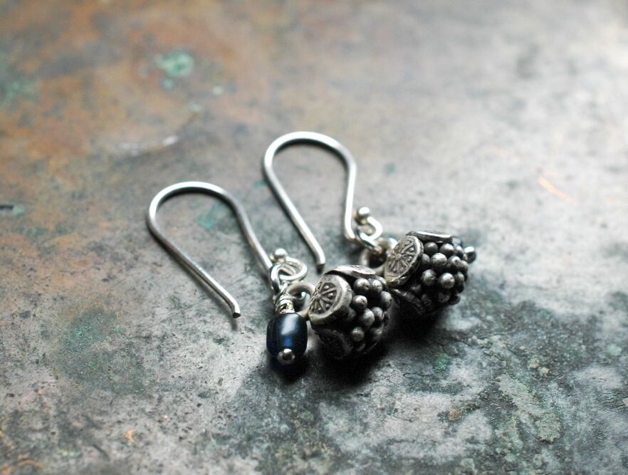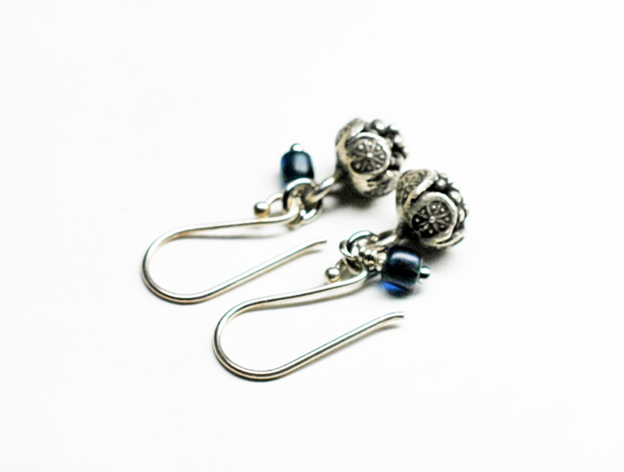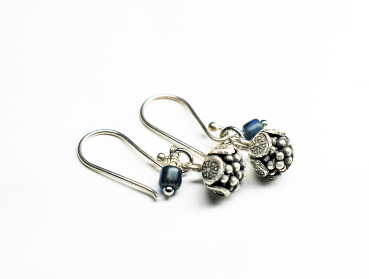 カレンシルバーの丸い花と一粒の灰青色アンティークビーズピアス