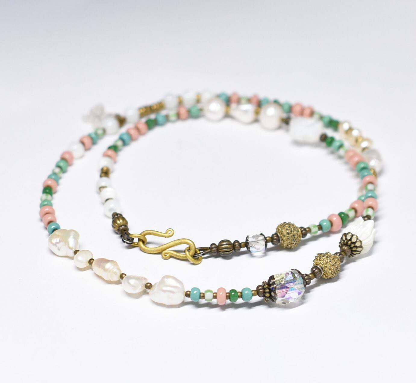 ヴィンテージオーロラビーズ、つぶつぶブラス、多彩マザーオブパール、淡水パール、フランスヴィンテージ、ピンクマサイを繋いだネックレスです。