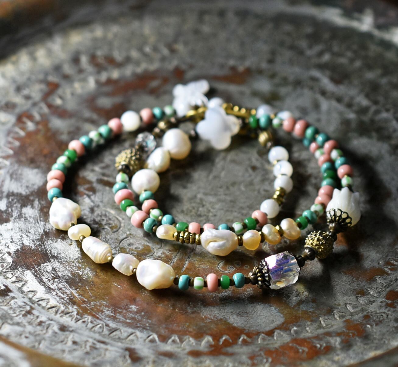 グリーンや、黄緑色の縞模様が入ったビーズはフランスのヴィンテージビーズです。