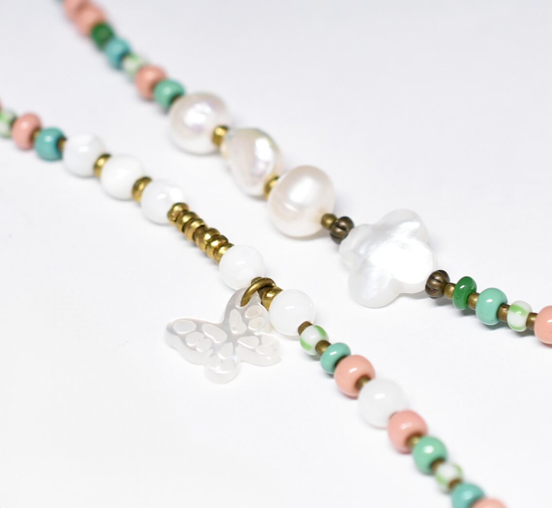 素材:ガラス、真鍮、淡水パール、マザーオブパール、ラピス、ワイヤー
