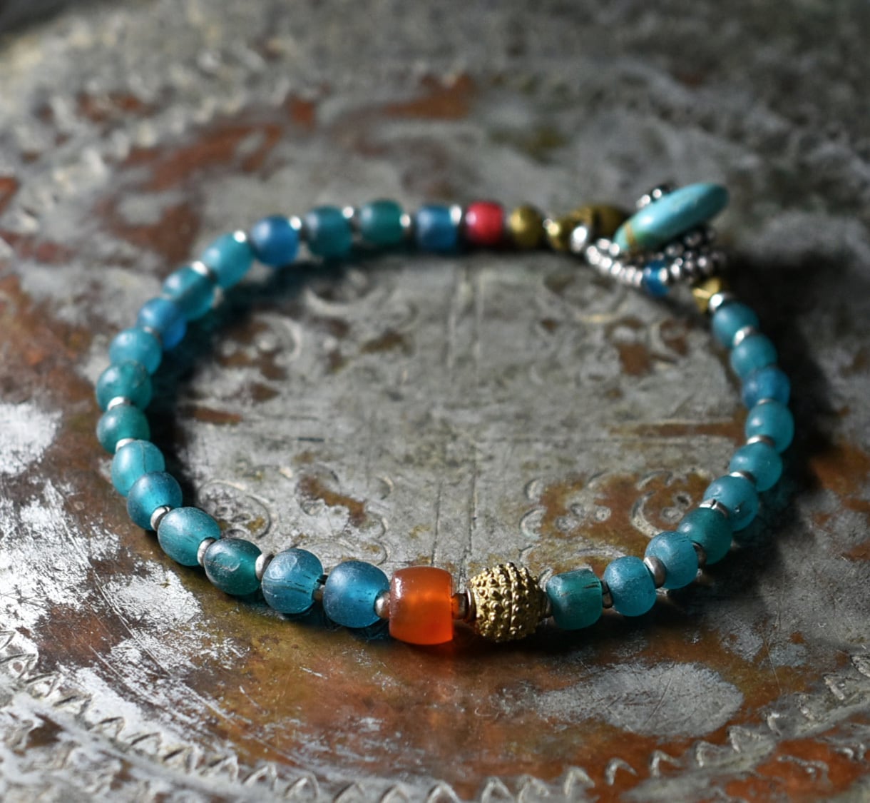 エメラルドグリーンジャワビーズとミゾーラムカーネリアン、つぶつぶブラス、金赤ホワイトハーツ、シャン族シルバーのブレス(ターコイズ留め金)