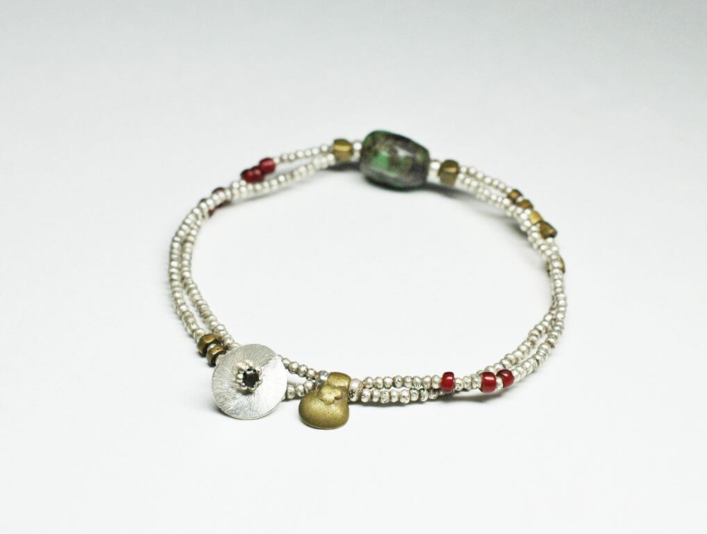 oldチベタンターコイズと、とっても濃い色のホワイトハーツ、小さなカレンシルバーなどを繋いだ2連のブレスです。