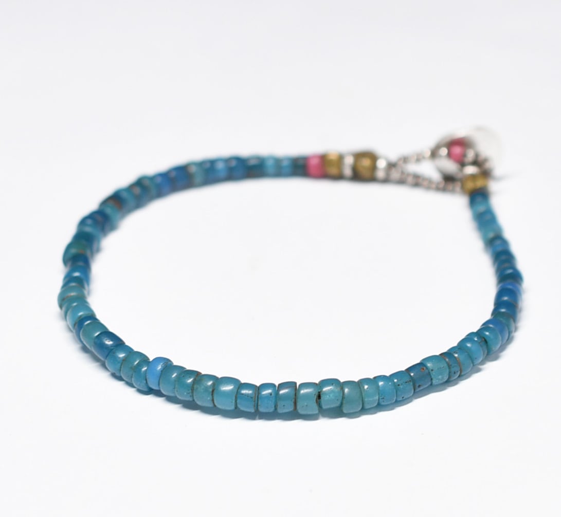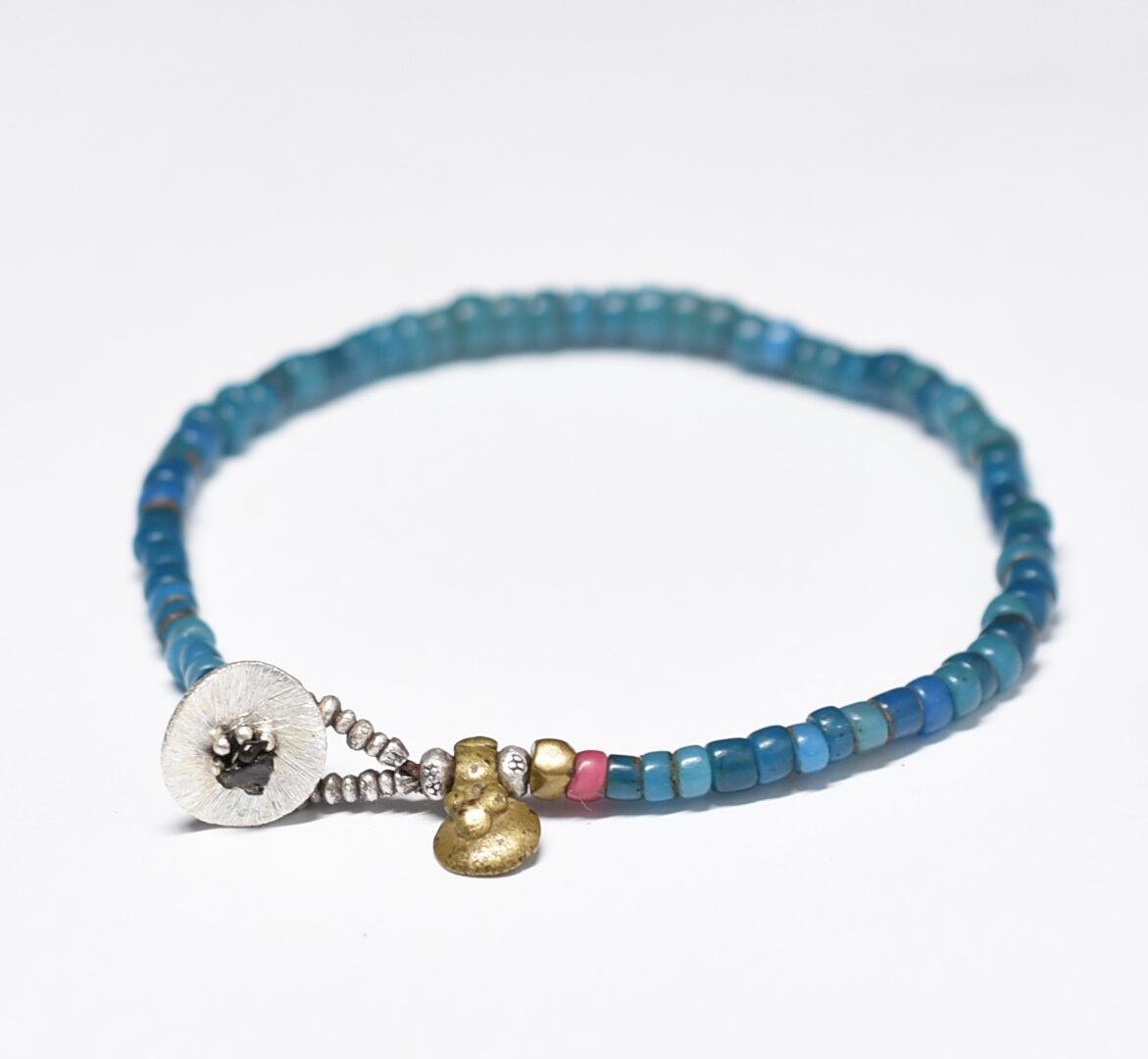 ピーコックブルーのビーズはインドのナガ族に渡った、古いヴェネチアビーズです。
