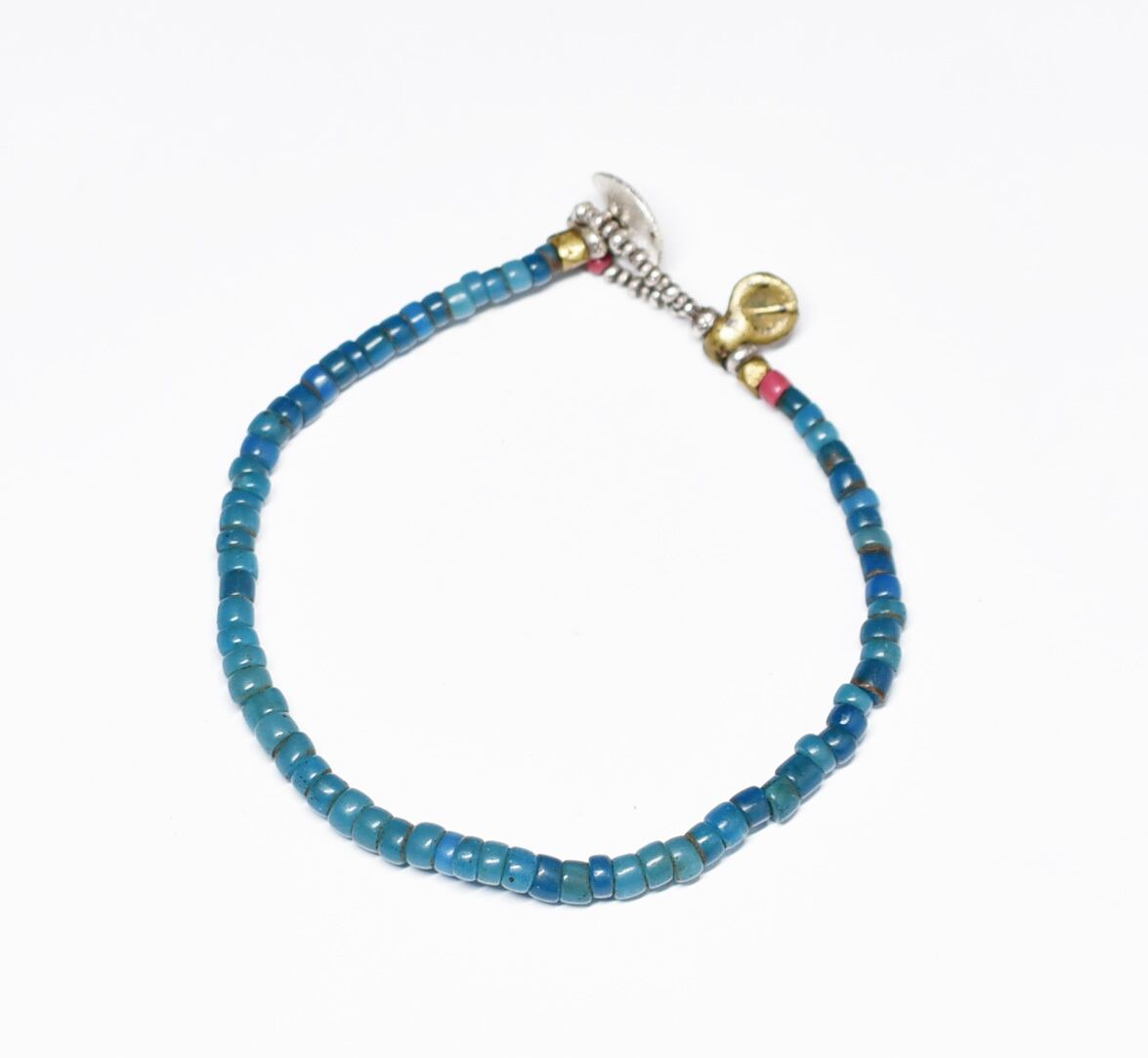 ピーコックブルーナガ族アンティークビーズと金赤ホワイトハーツのブレス
