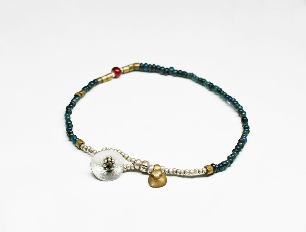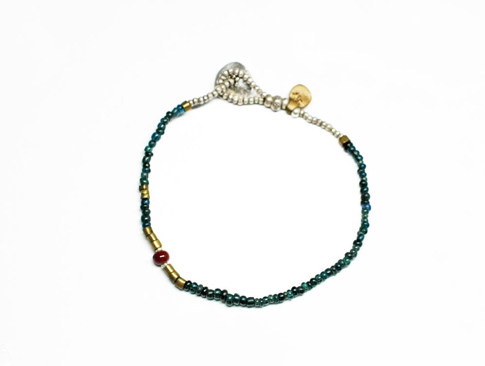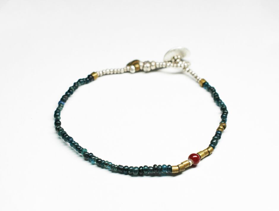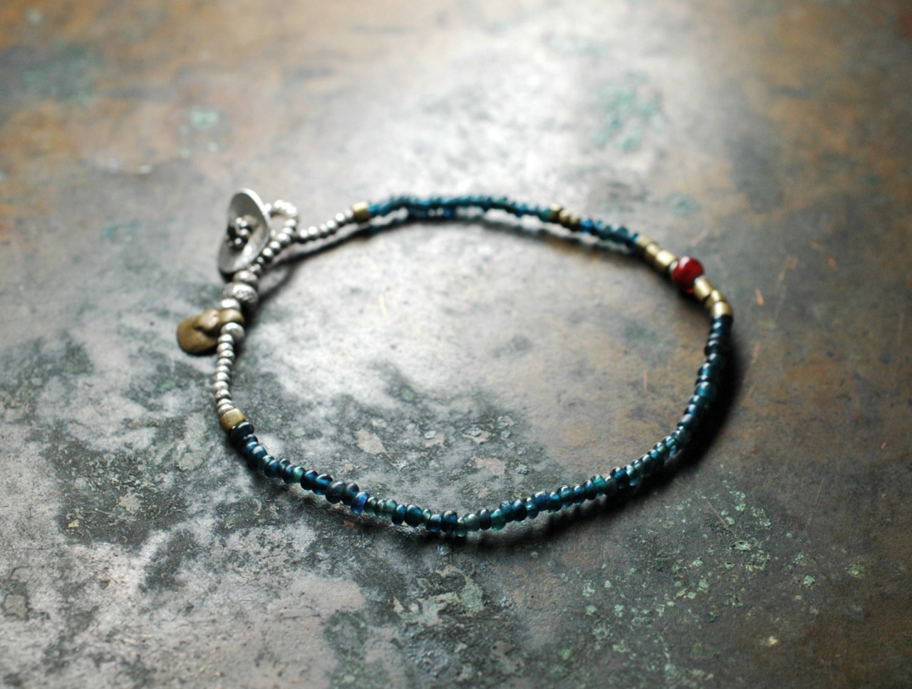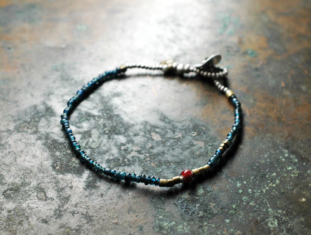 インディゴブルーのアンティークビーズと、oldオリッサブラス、小さなカレンシルバーに濃赤色のホワイトハーツを一粒入れたブレスです。