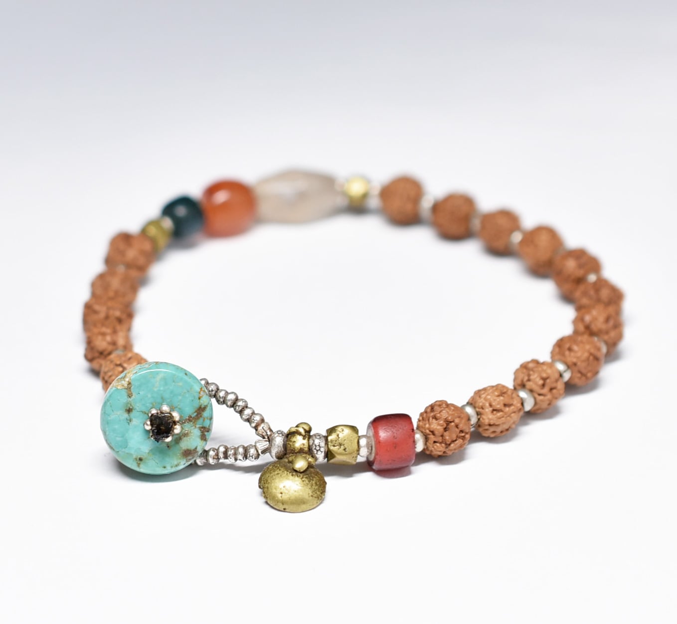 素材:ルドラクシャ、アフリカ出土瑪瑙、ミゾーラムカーネリアン、ガラス、カレンシルバー、シャン族シルバー、oldオリッサブラス、ターコイズロウビキ紐