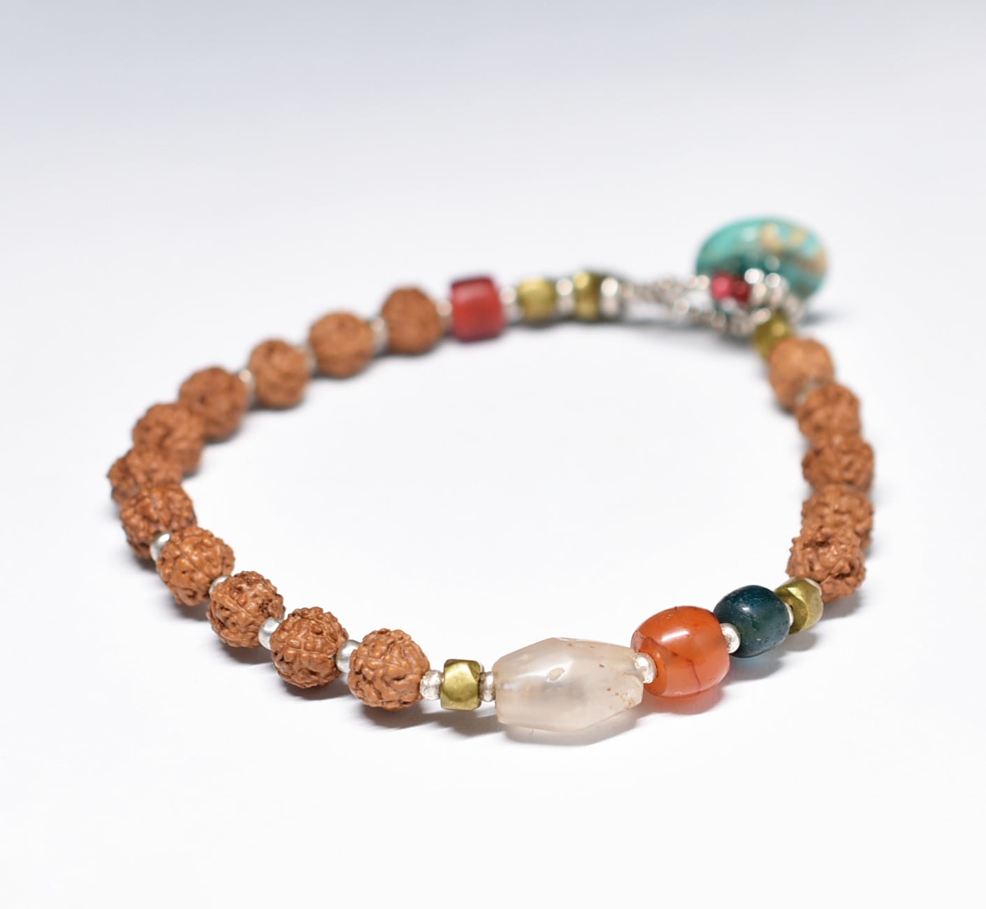 ルドラクシャとアフリカ出土瑪瑙、ミゾーラムカーネリアン、グリーンブルービーズ、金赤ホワイトハーツのブレス