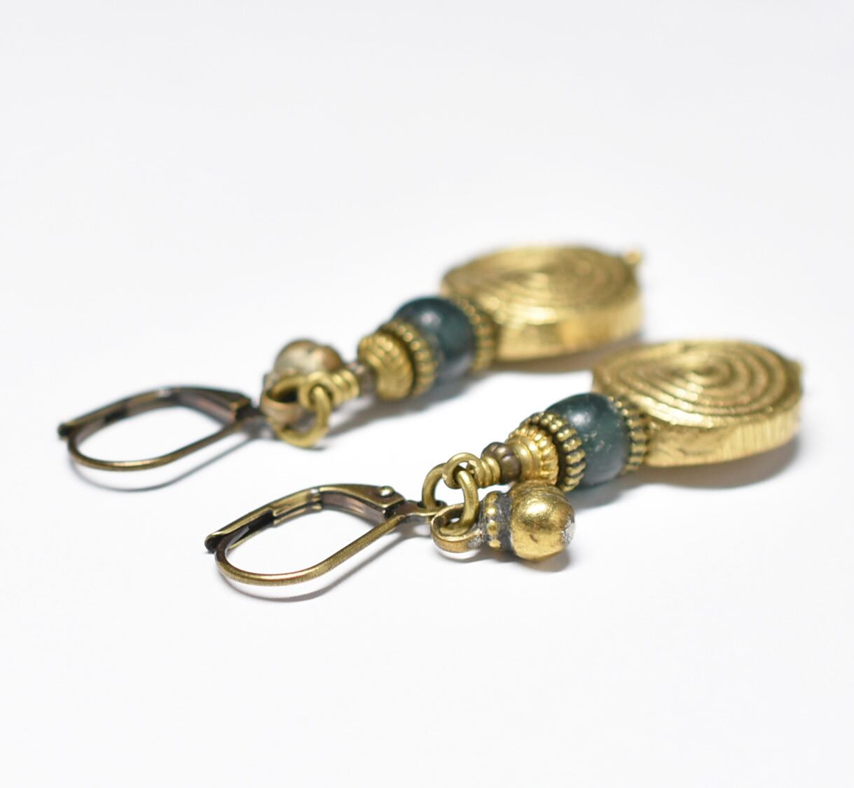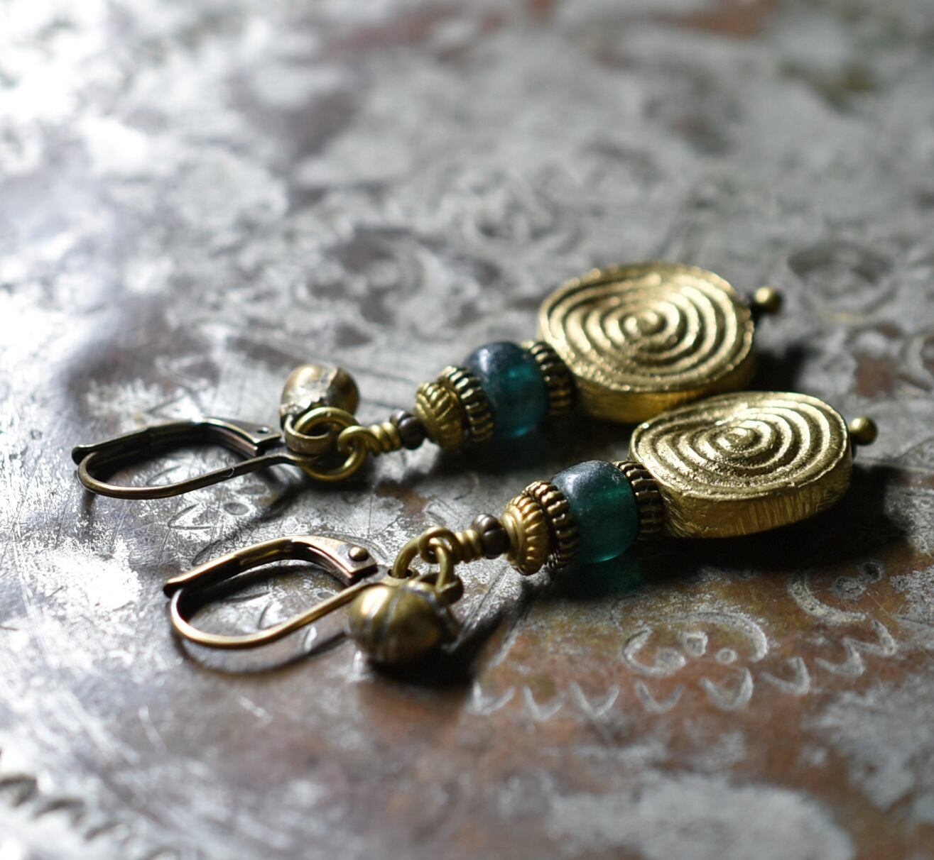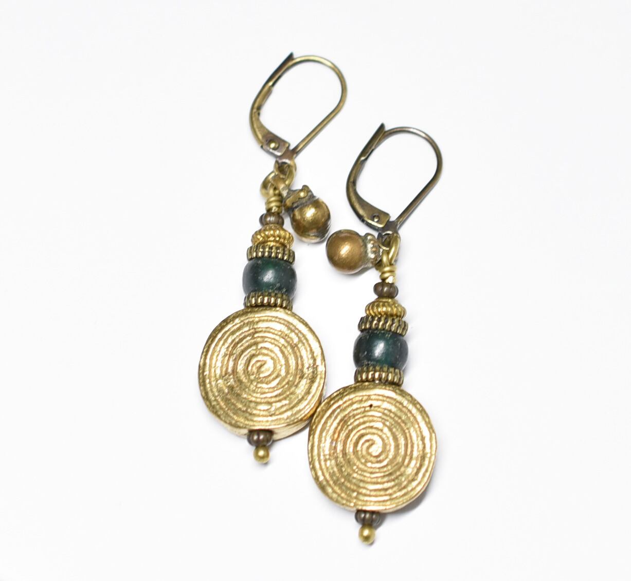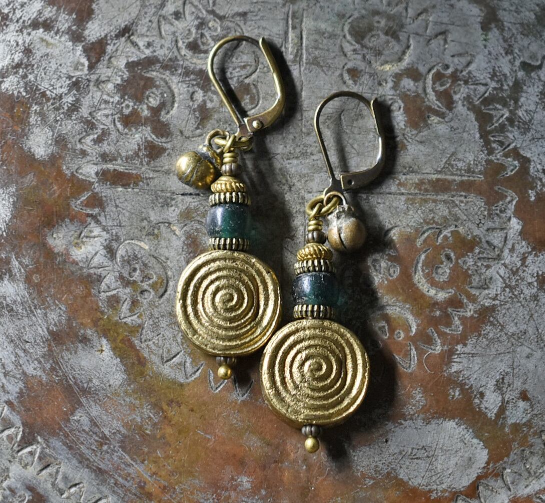 渦巻きアフリカンブラスとグリーンブルービーズ、民族鈴のピアス