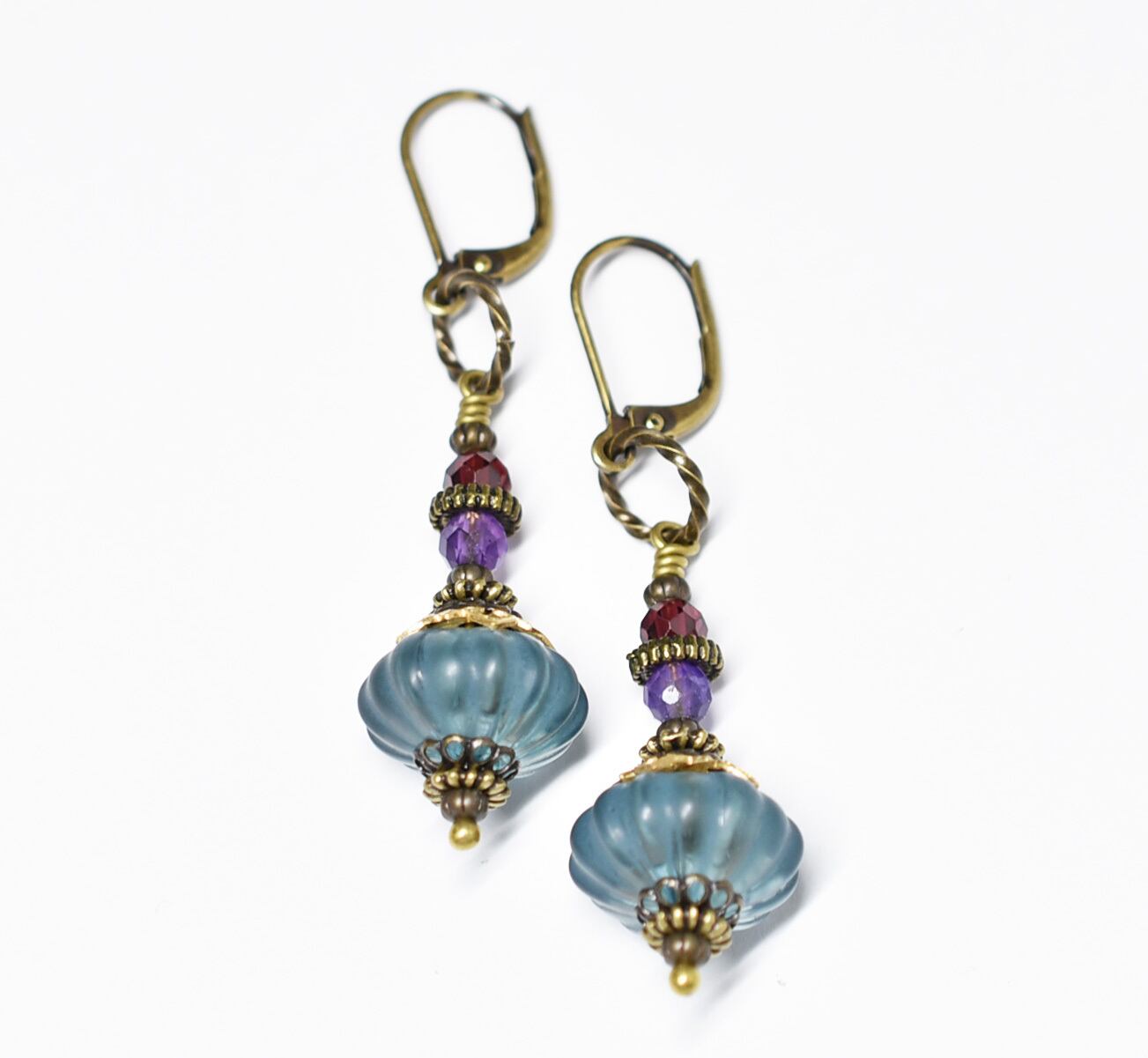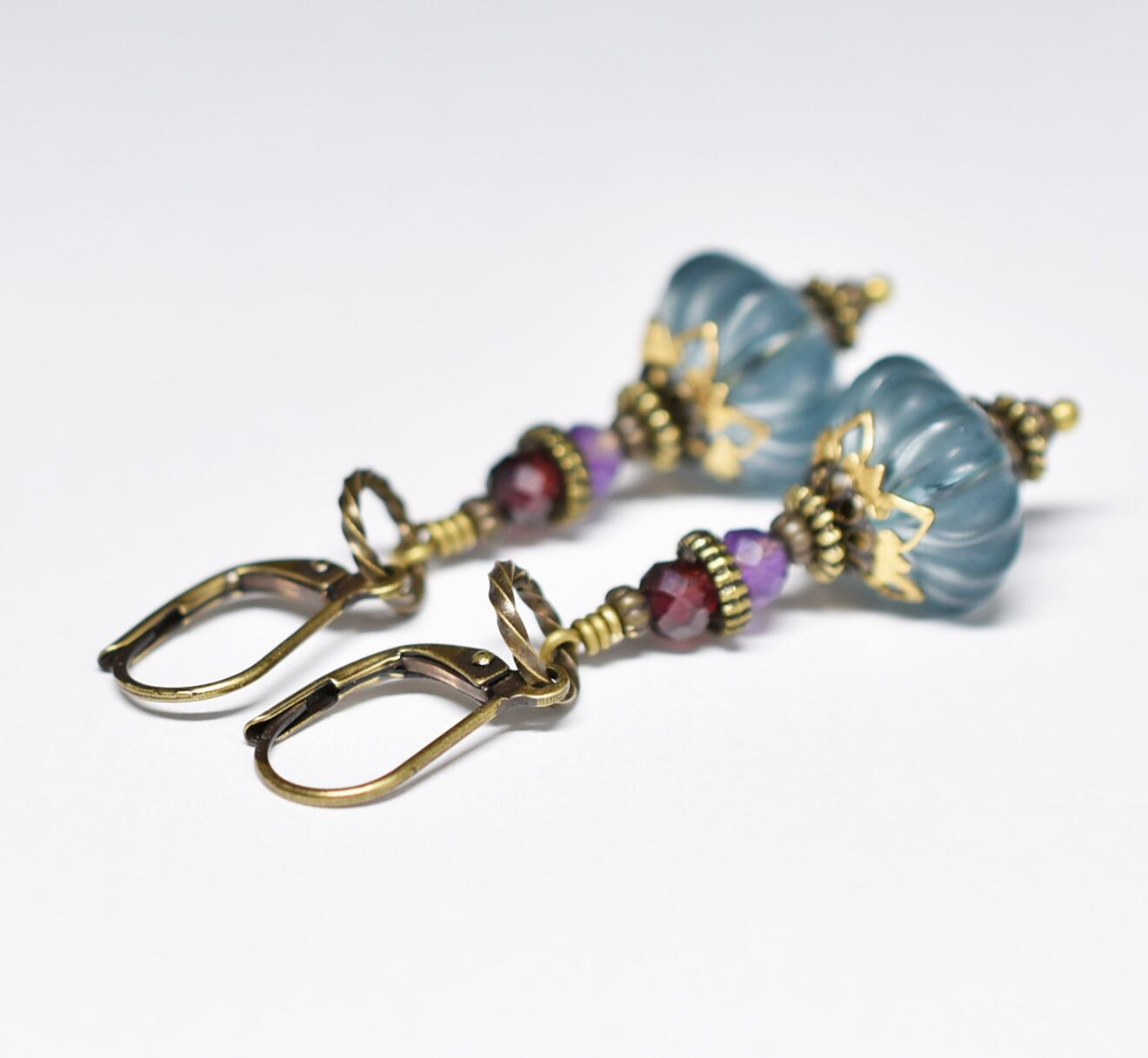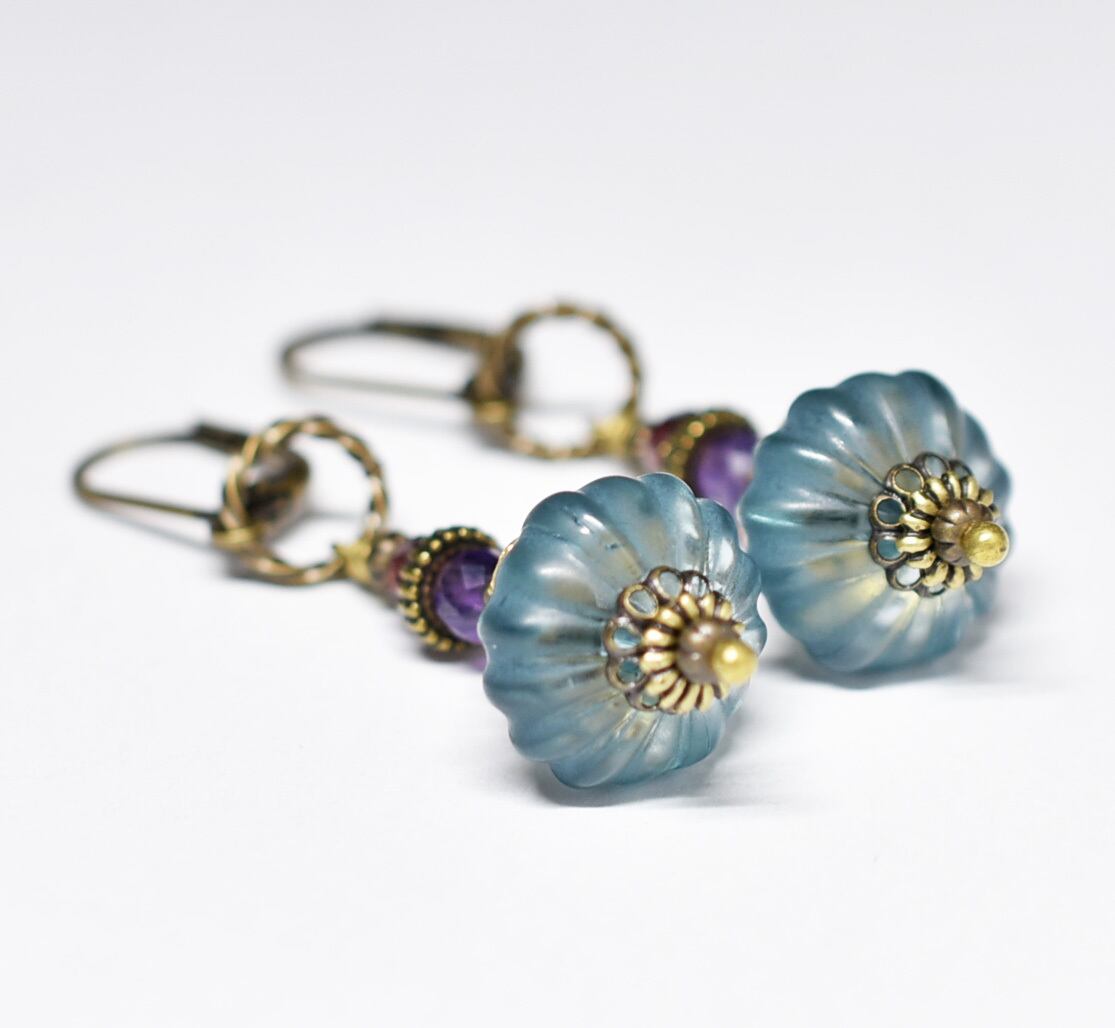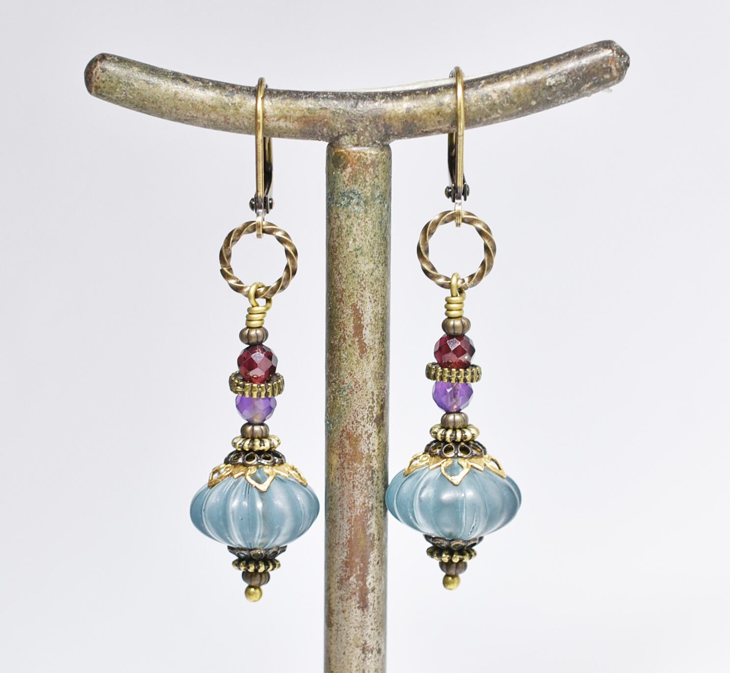 アイアンブルーjapanヴィンテージビーズとアメジスト、ガーネットを繋いだピアスです。