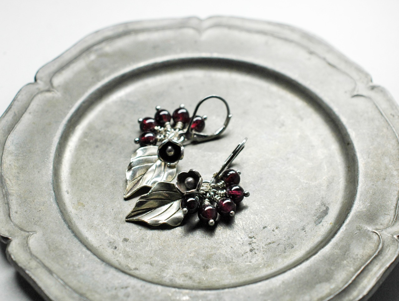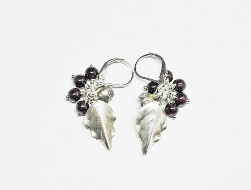 たわわなガーネットとボタニカルカレンシルバーのピアス