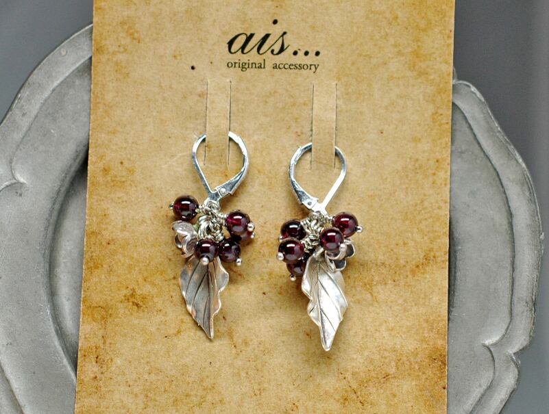とっても深いボルドー色をしたガーネットはづつ片耳に5粒づつ実らせています。