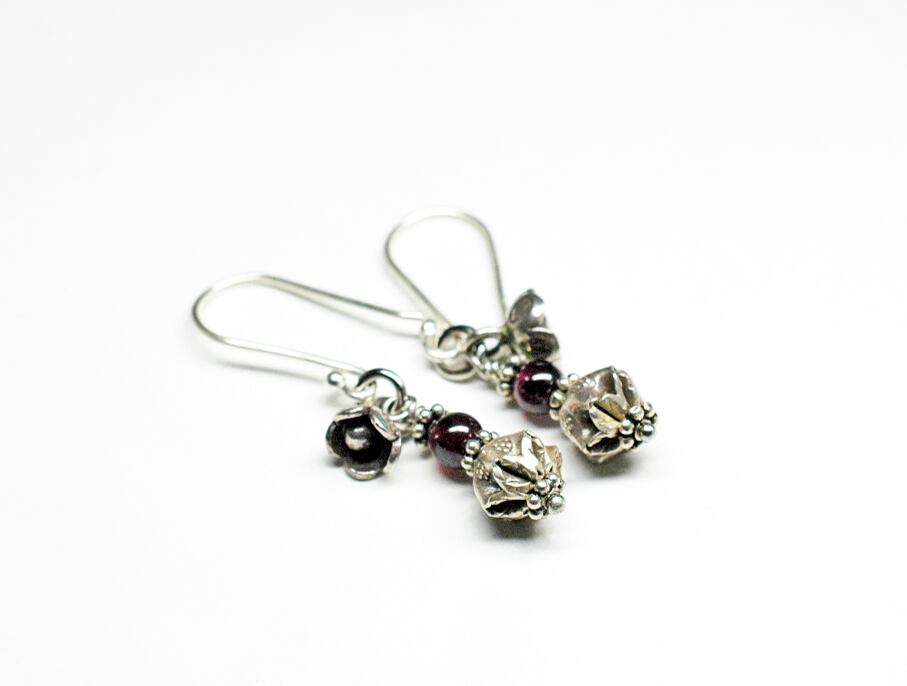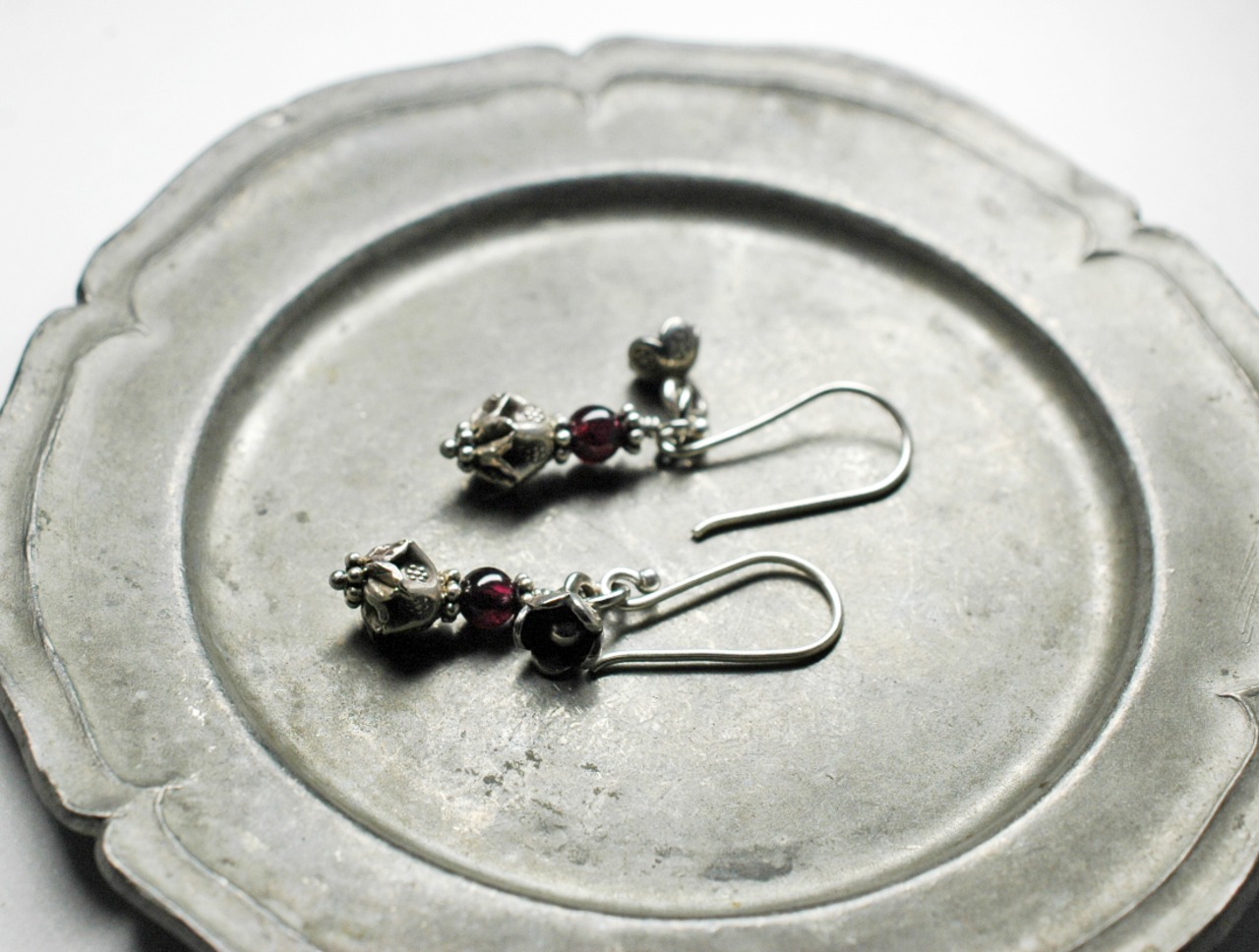 丸いガーネットと、巾着のようなカレンシルバービーズと小さなお花チャームを繋いだピアスです。