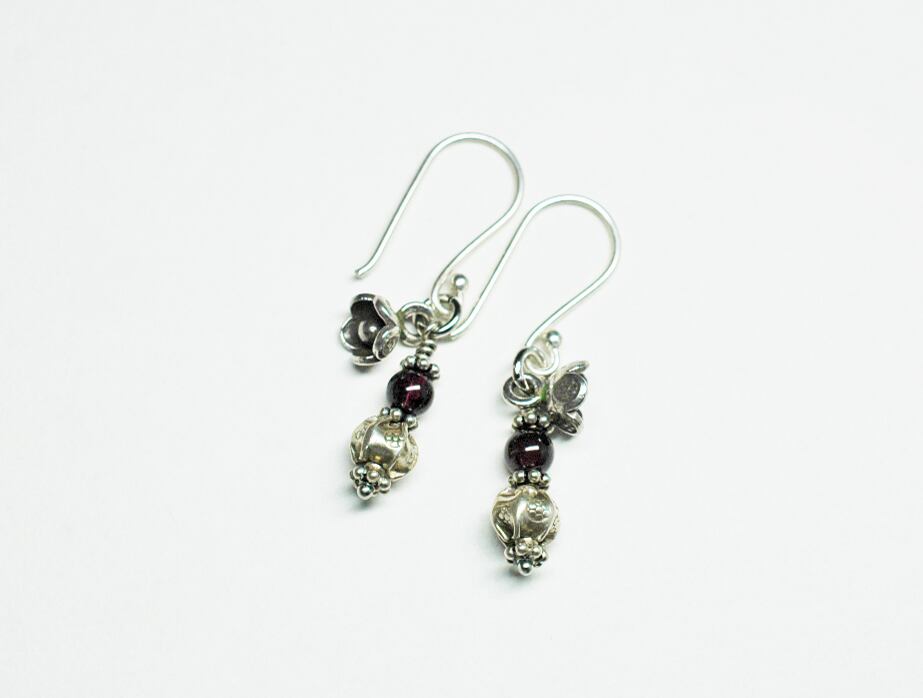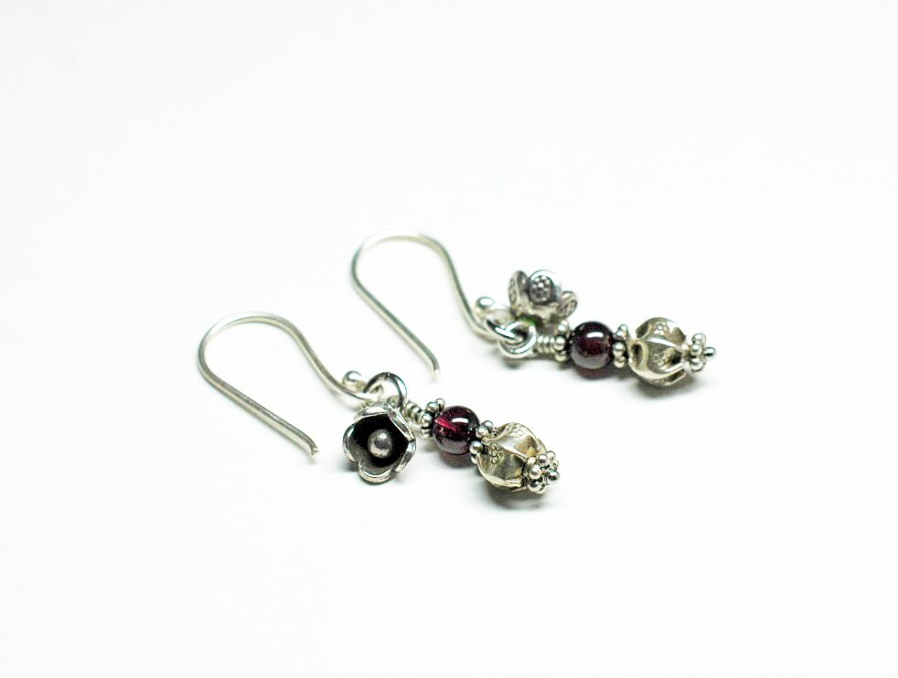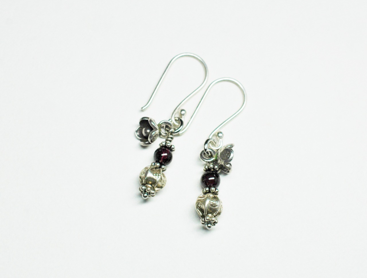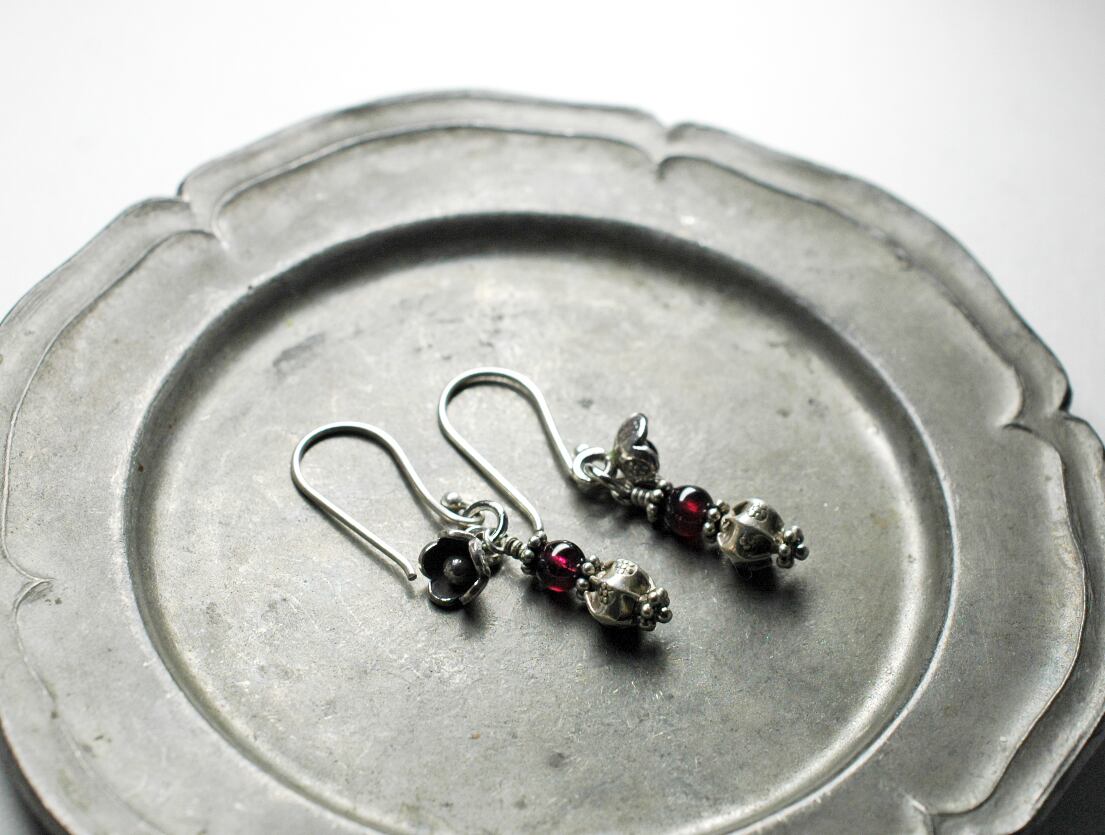 丸いガーネットと、両端をぎゅっと絞ったカレンシルバービーズと小さなお花チャームを繋いだピアスです。