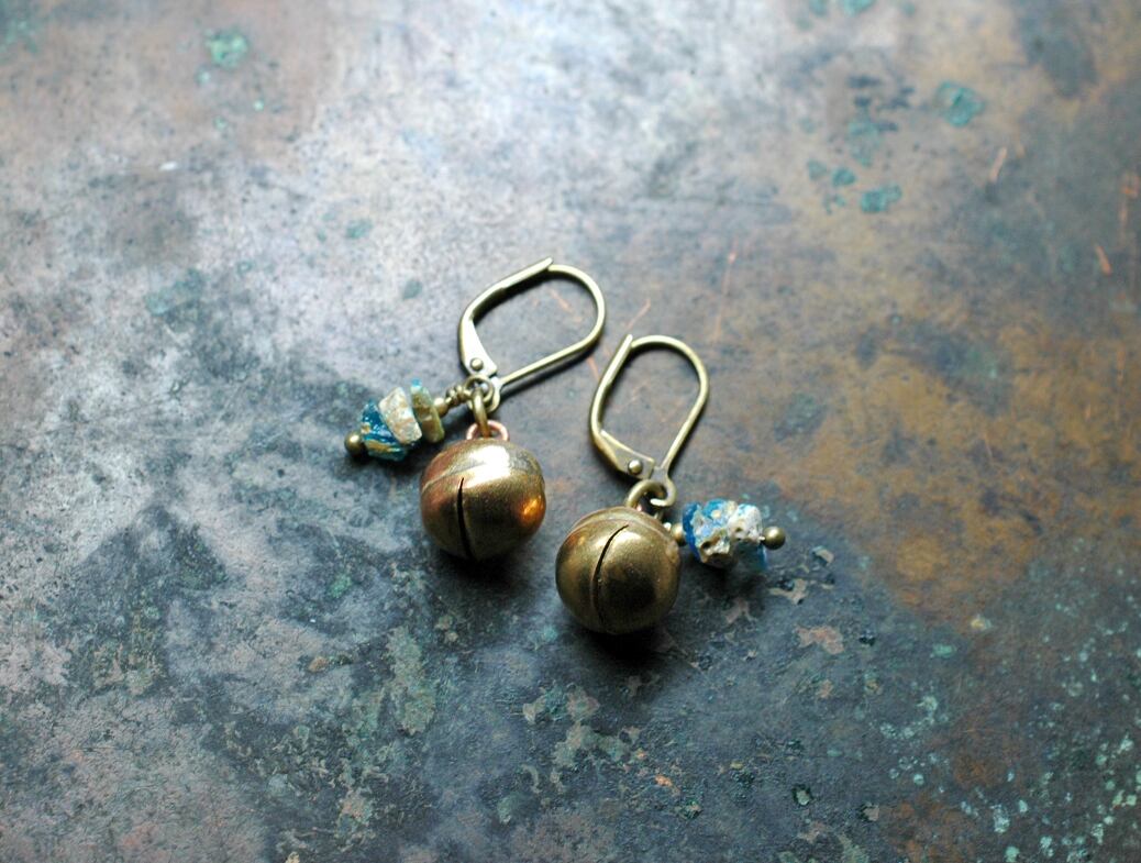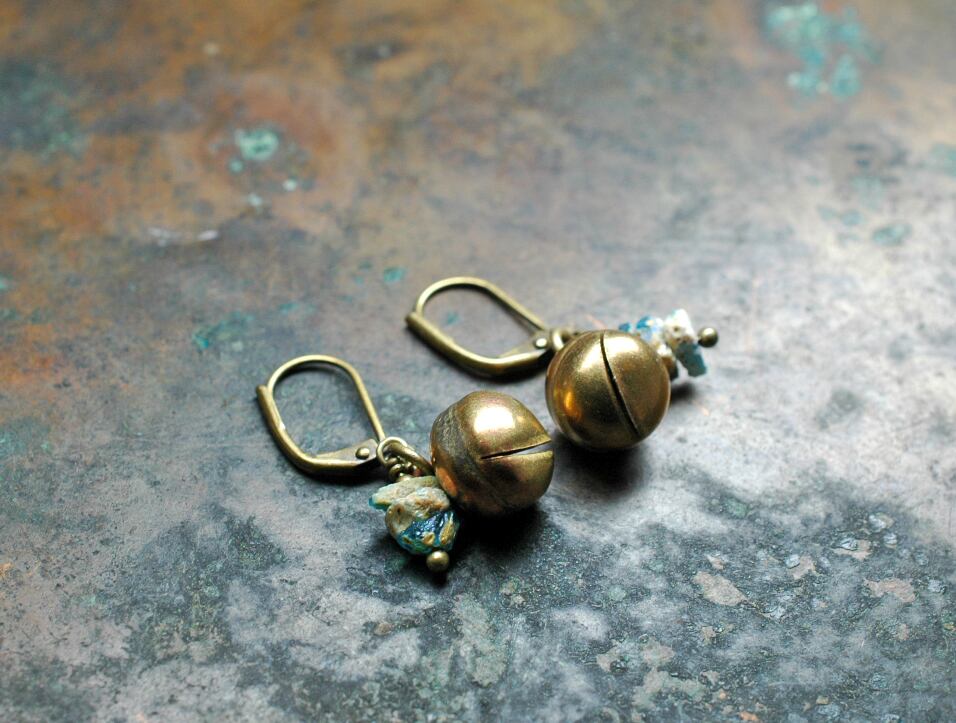 タイから届いた鈴と、ローマングラスの小さなビーズを繋いだピアスです。