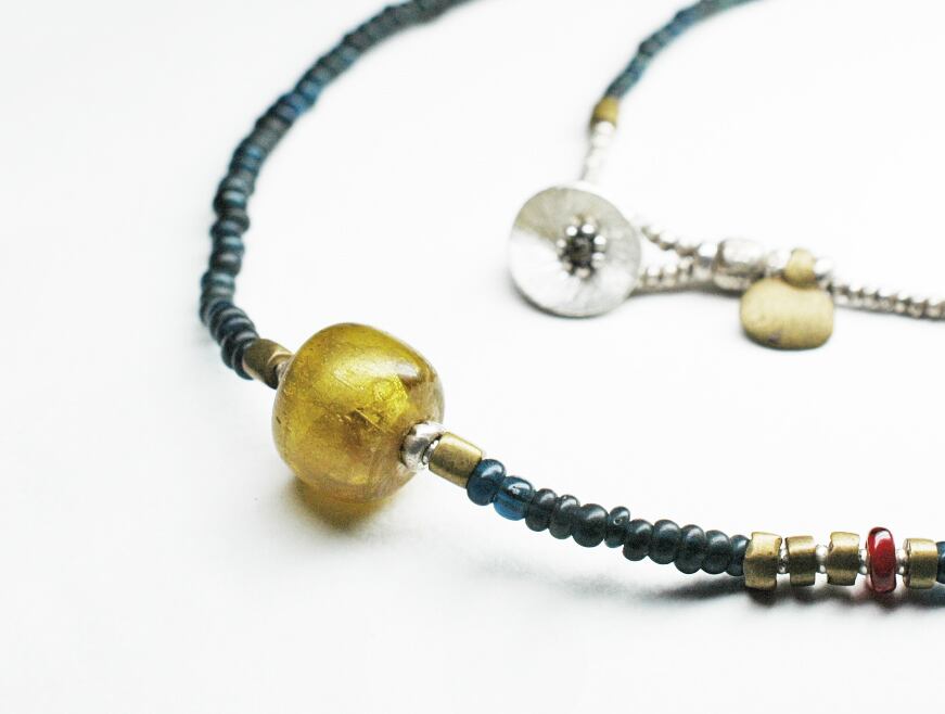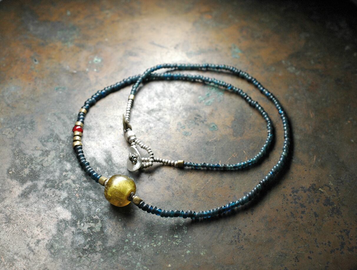 ゴールドサンドイッチとインディゴブルーのアンティークビーズ、oldオリッサブラス、一粒濃い赤色のホワイトハーツを繋いだネックレスです。