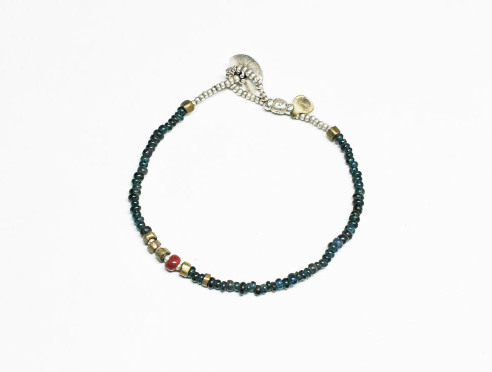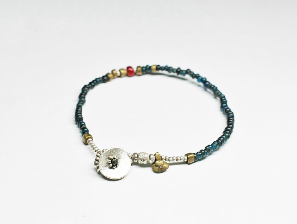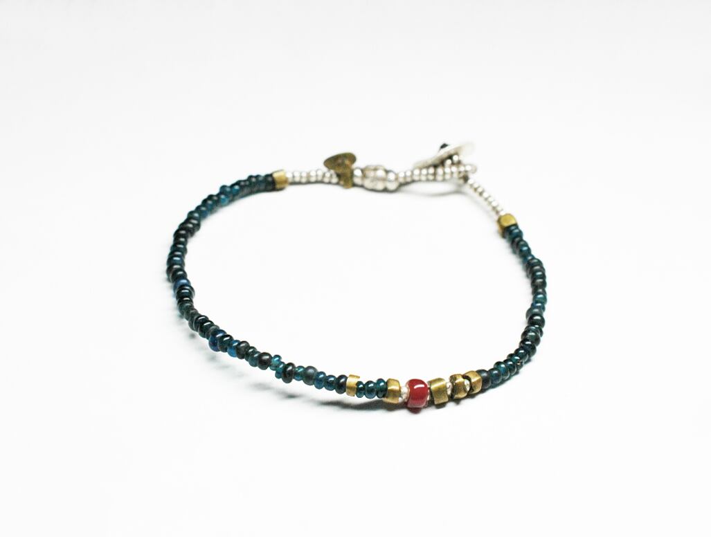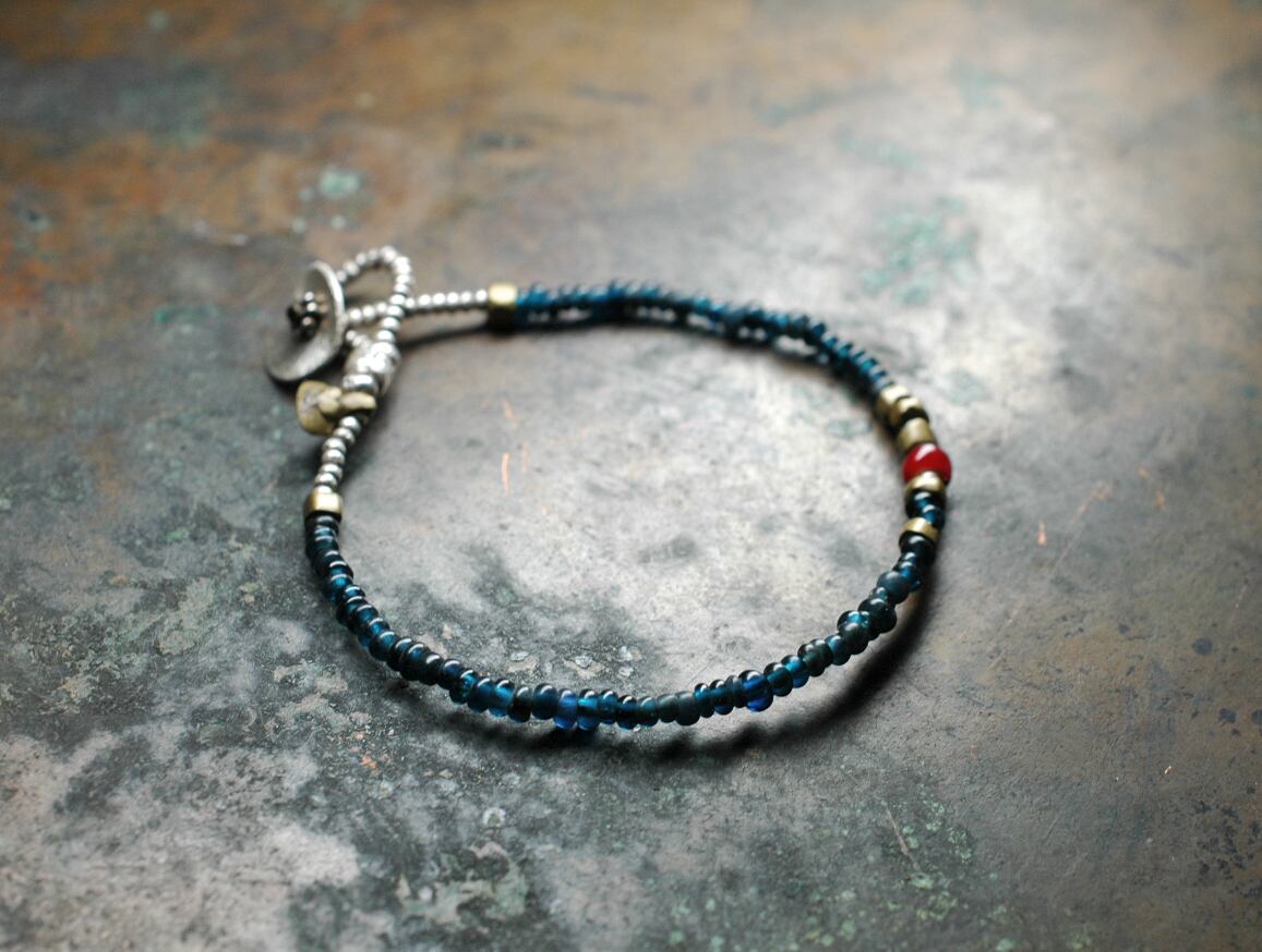 インディゴブルーのアンティークビーズと、oldオリッサブラス、小さなカレンシルバーに濃赤色のホワイトハーツを一粒入れたブレスです。