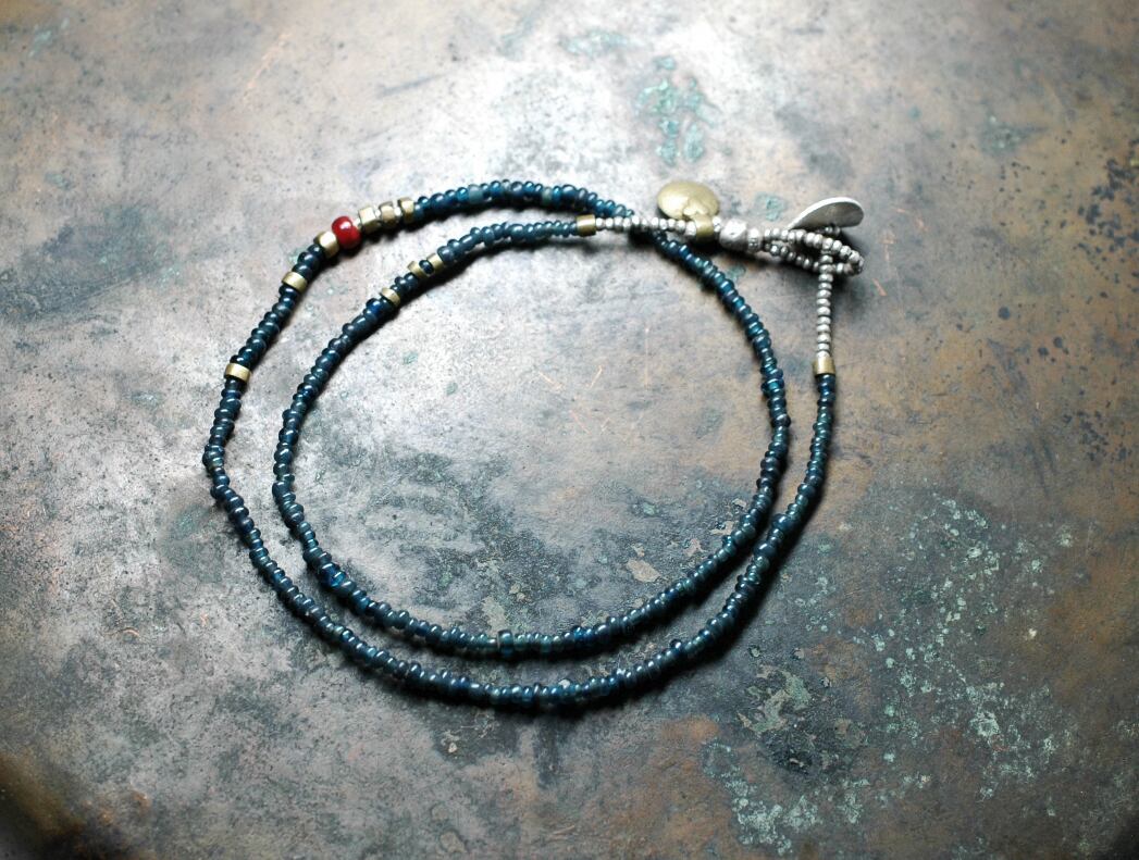 インディゴブルーのアンティークビーズと、oldオリッサブラス、小さなカレンシルバーに濃赤色のホワイトハーツを一粒入れたネックレスです。
