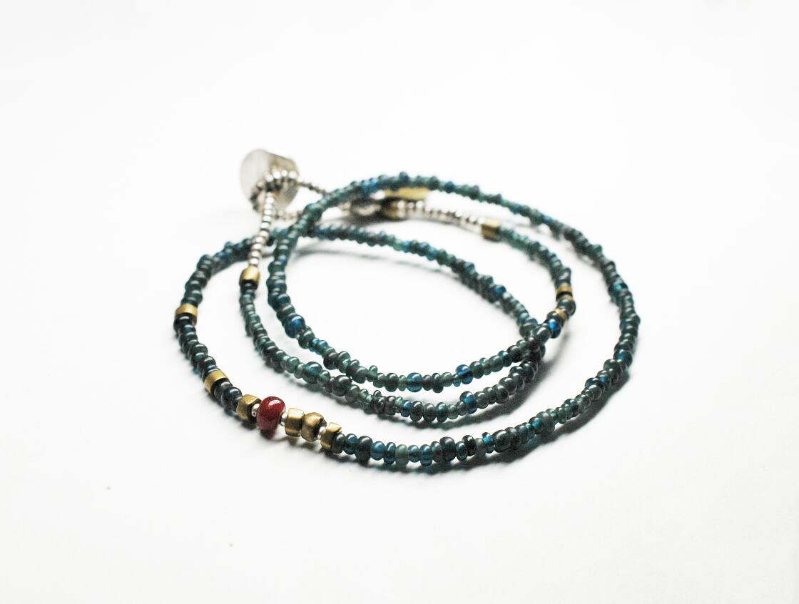 ロウビキ紐で繋いでいますので、最初はやや硬めですが身に着けていくうちにしなやかになります。