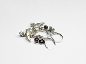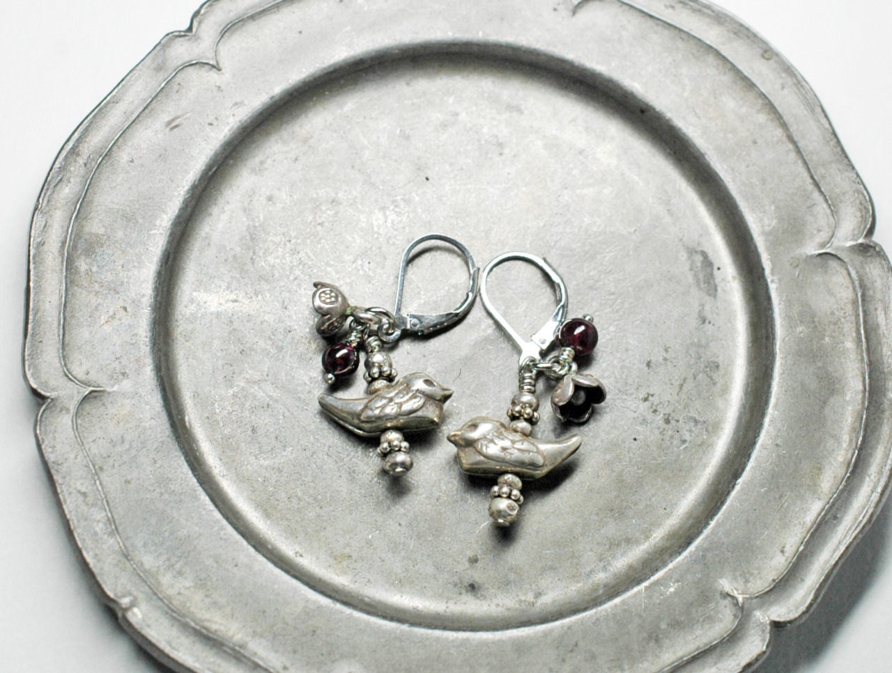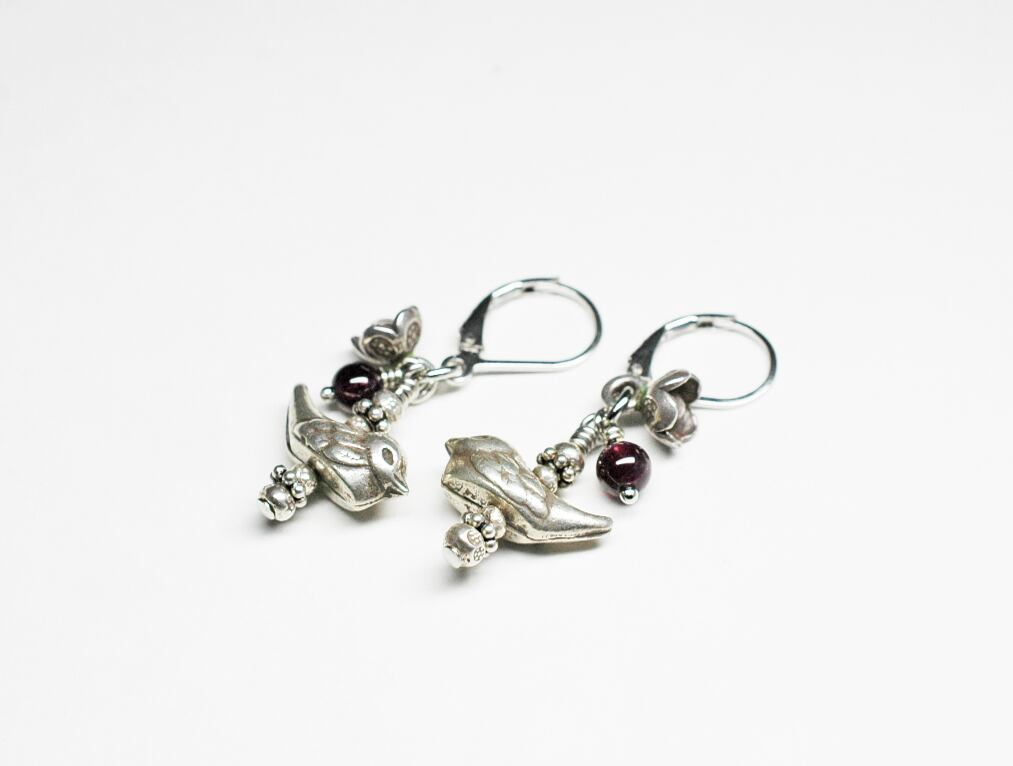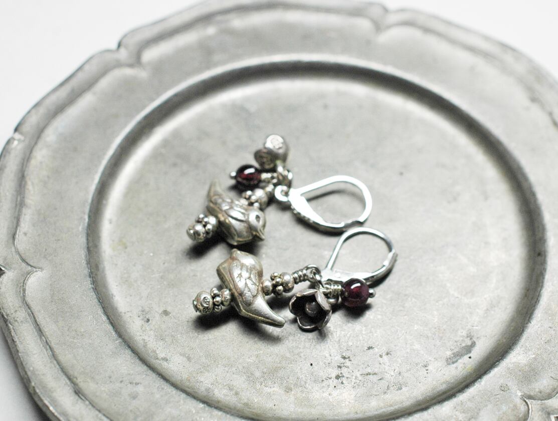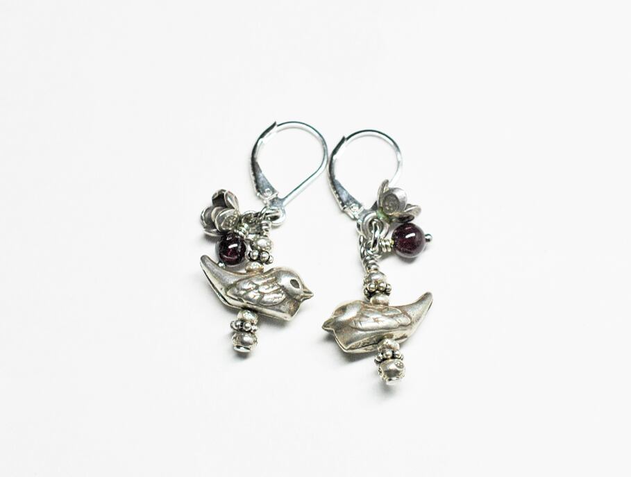 小鳥とお花、ガーネットのシルバーピアス