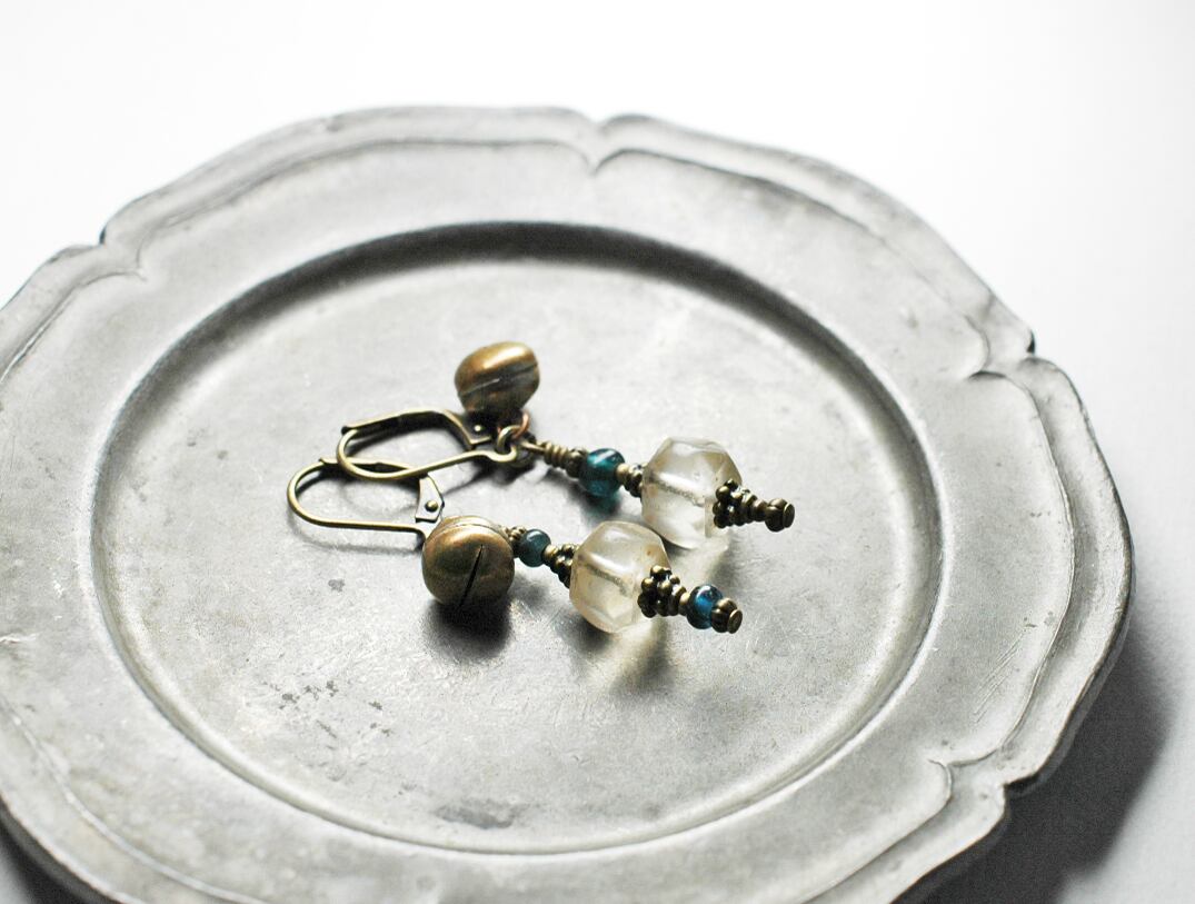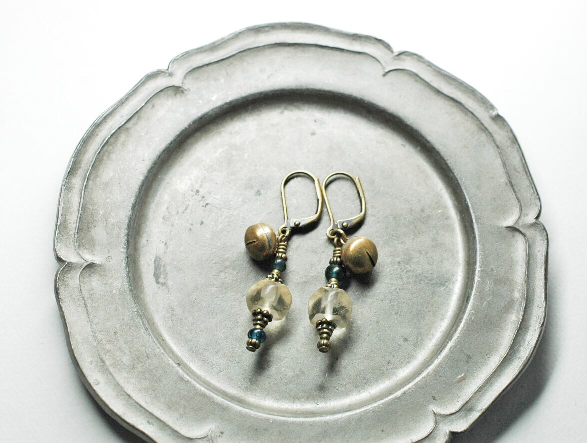ぽってりアンティークボヘミアビーズと鈴のアンシメトリーピアス