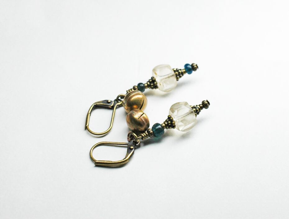 ぽってりとしたボヘミアのアンティークビーズと、タイから届いた鈴、インディゴブルーのビーズを繋いだアンシメトリーなピアスです。