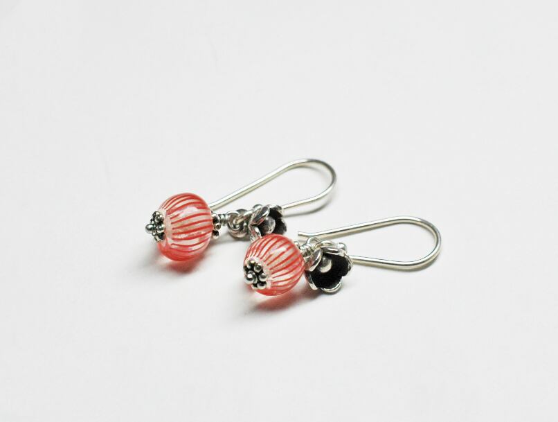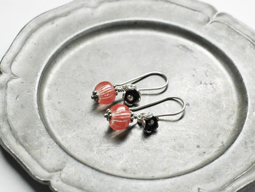 赤色のシマシマビーズに、カレンシルバーの花のチャームを付けた可愛らしいピアスです。