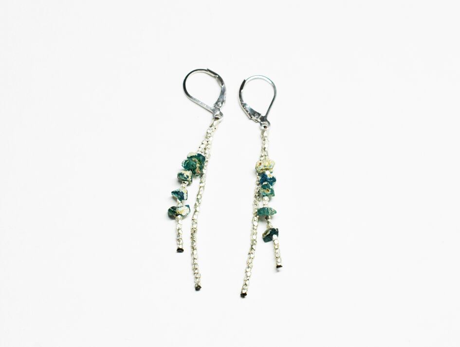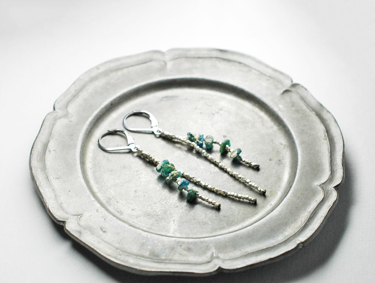 ブルーローマングラスと、丸いクリア色のローマングラス、キラキラとしたカレンシルバーを繋いだピアスです。