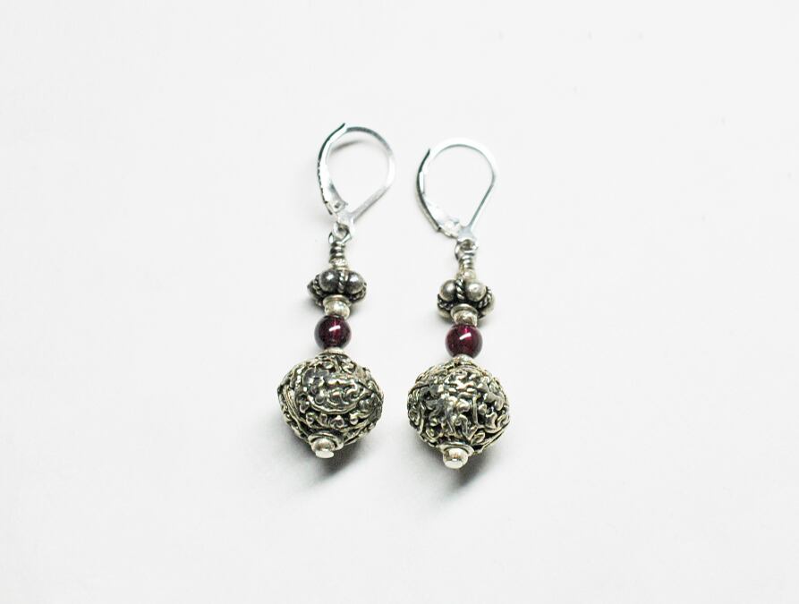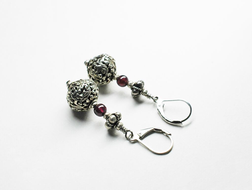 タイで見つけた繊細な装飾がされた丸いメタルビーズと、ガーネットを繋いだピアスです。
