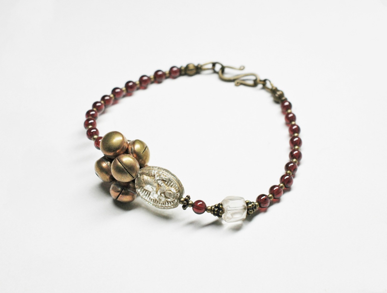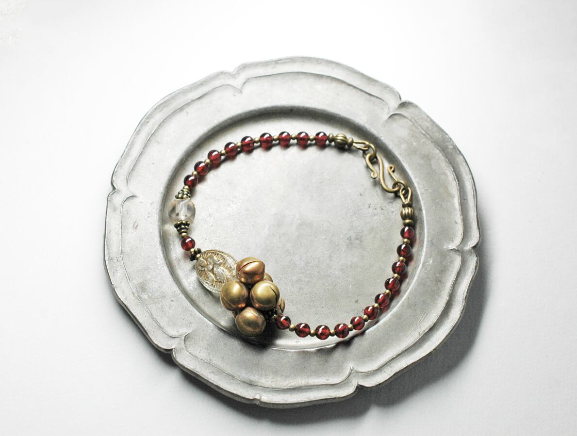 デッドストックのロザリオパーツと、ガーネット、たわわな鈴を実らせたブレスです。