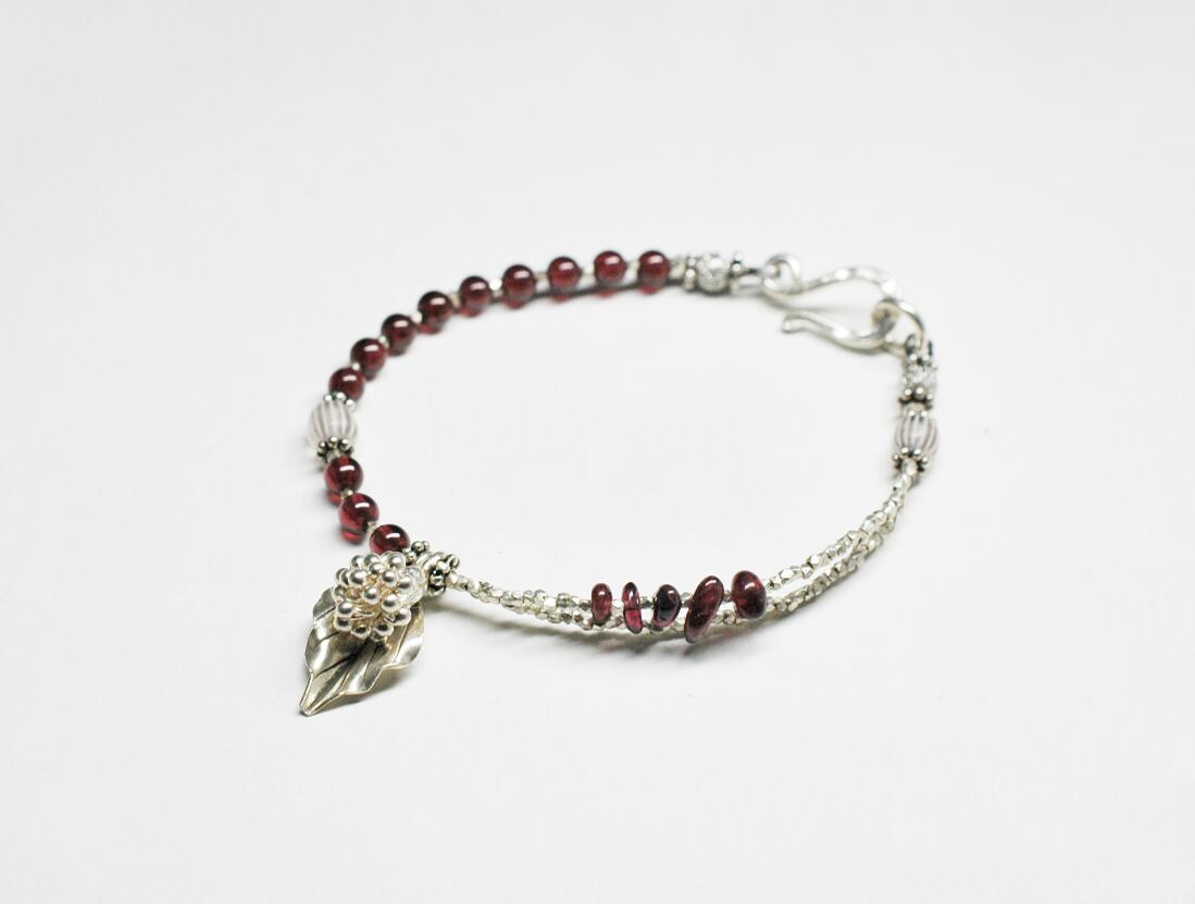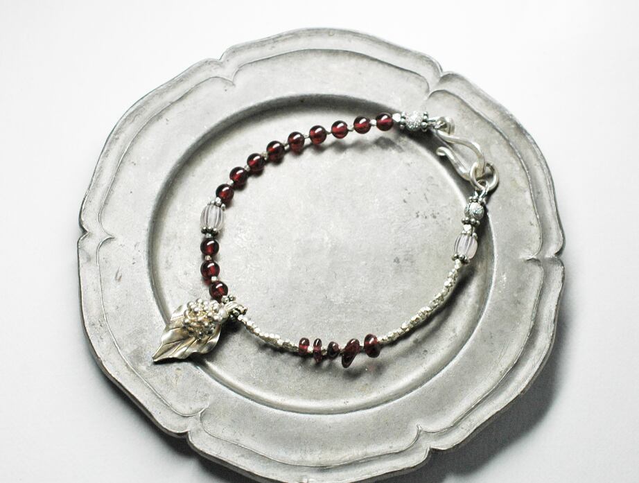 丸いガーネット、ボタニカルのチャームを煌めくカレンシルバーで繋いだブレスです。