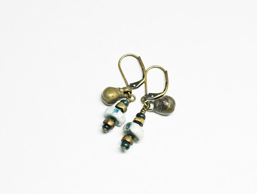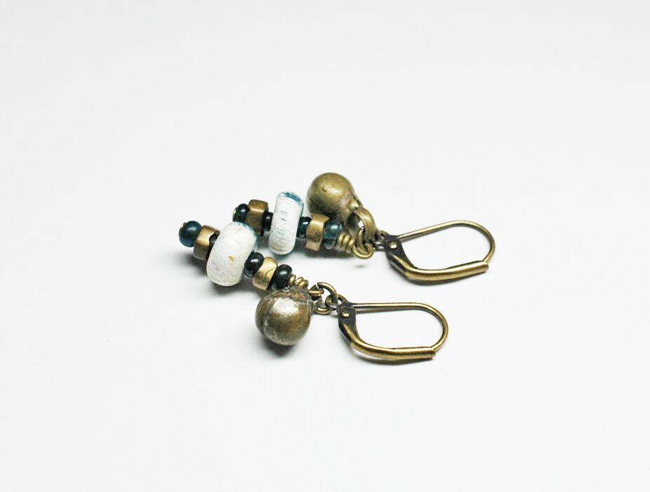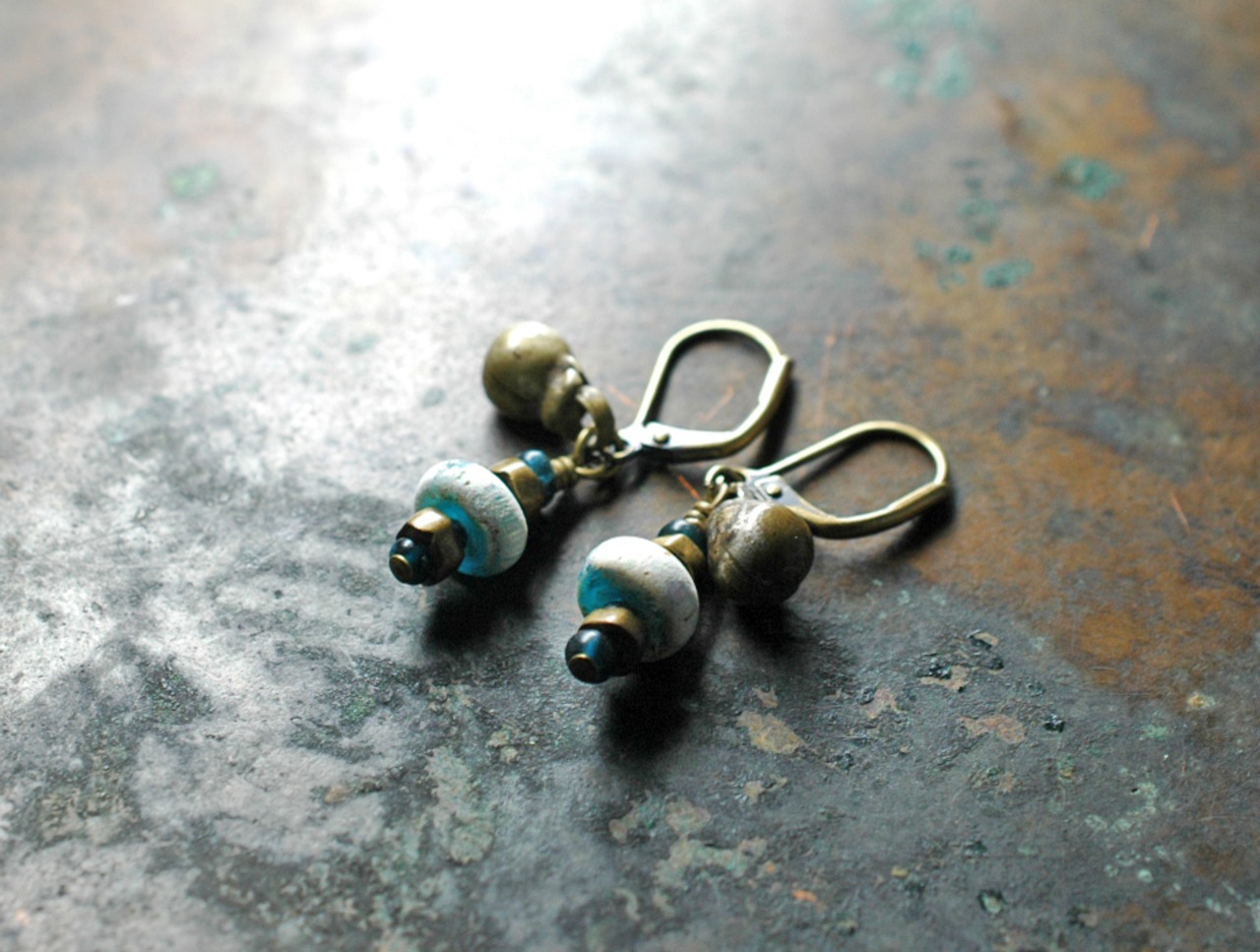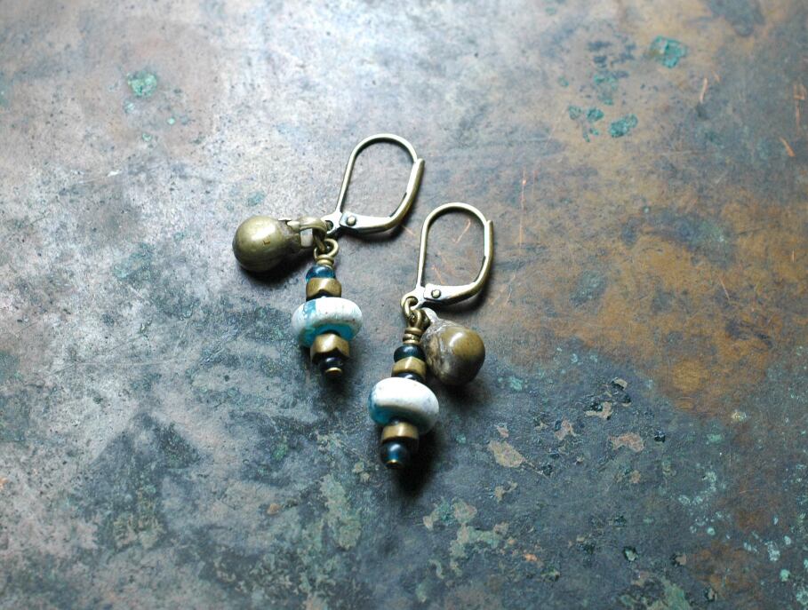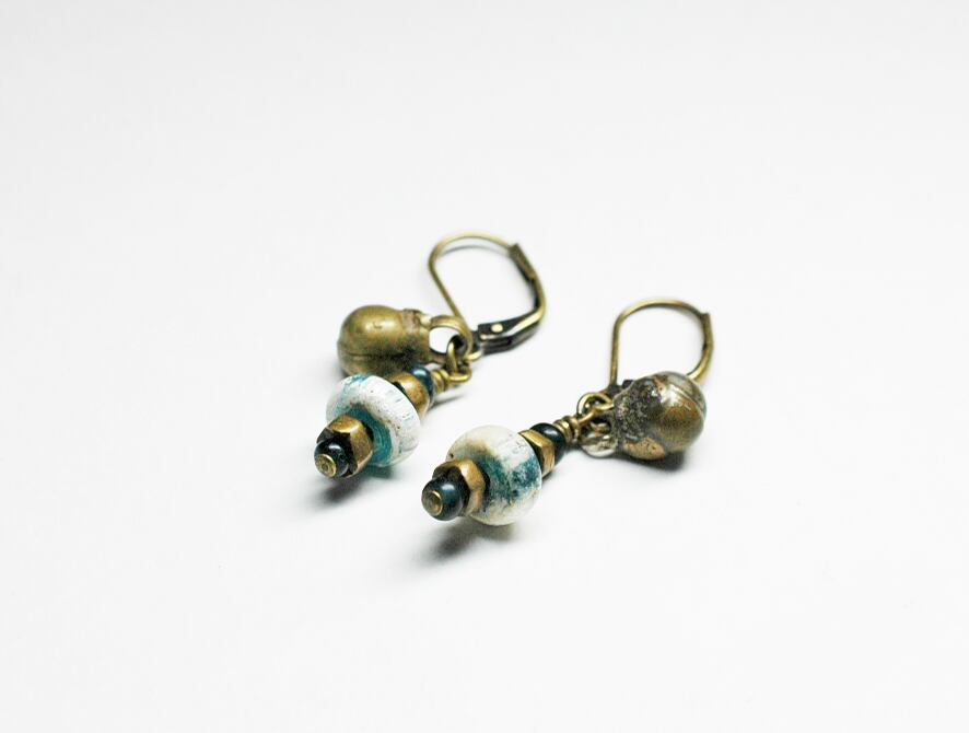 発掘ビーズと、インディゴブルービーズ、oldオリッサブラスを繋いだピアスです。