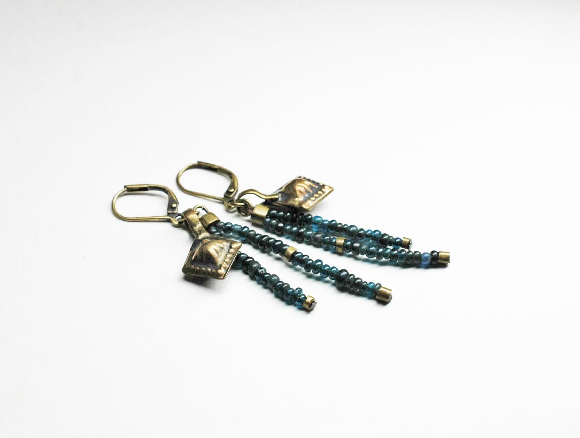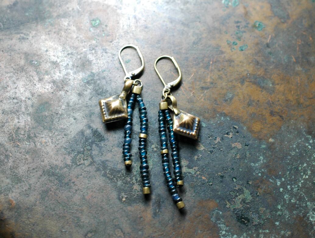インディゴブルービーズを二連にして、oldオリッサブラスを繋ぎ、民族チャームを入れたピアスです。