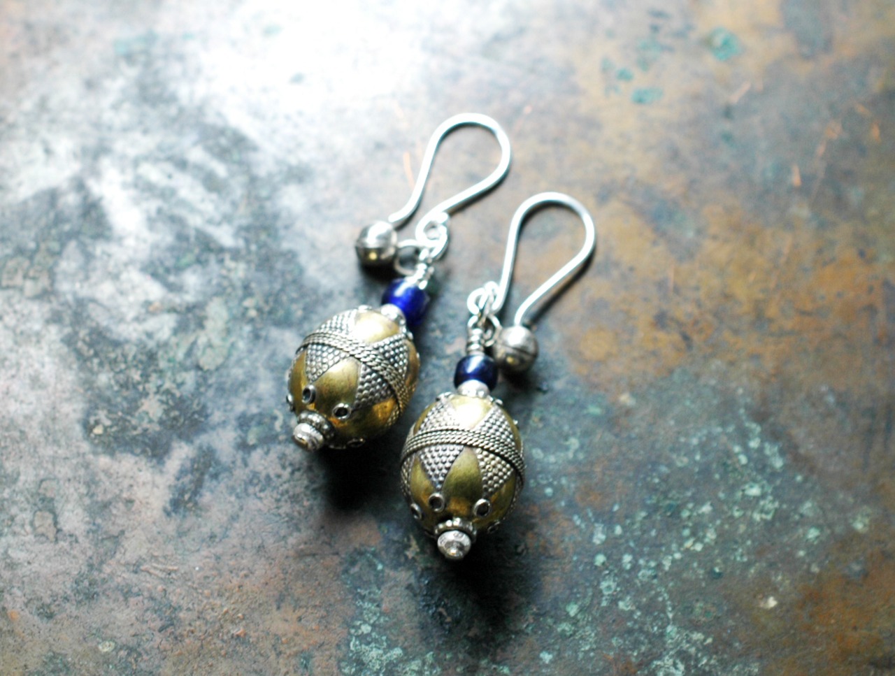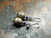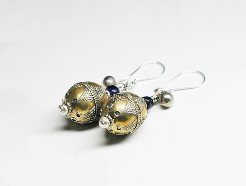 トルクメニスタンから届いたメタルビーズに瑠璃色のアンティークビーズと鈴を一粒つけたピアスです。