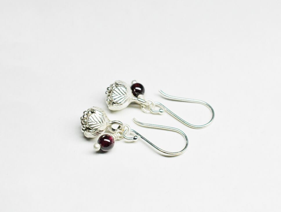 カレンシルバーの丸い花とガーネットのピアス(ホワイトシルバー)