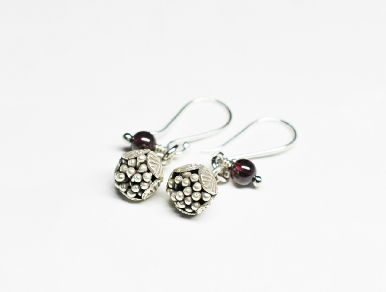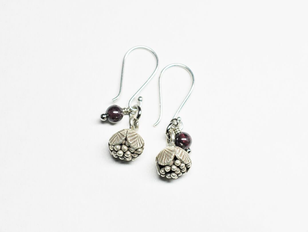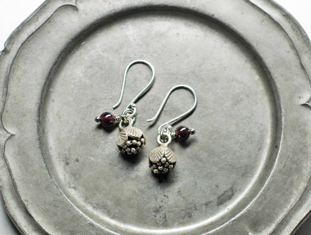 カレンシルバーの丸い花とガーネットのピアス(燻し加工)
