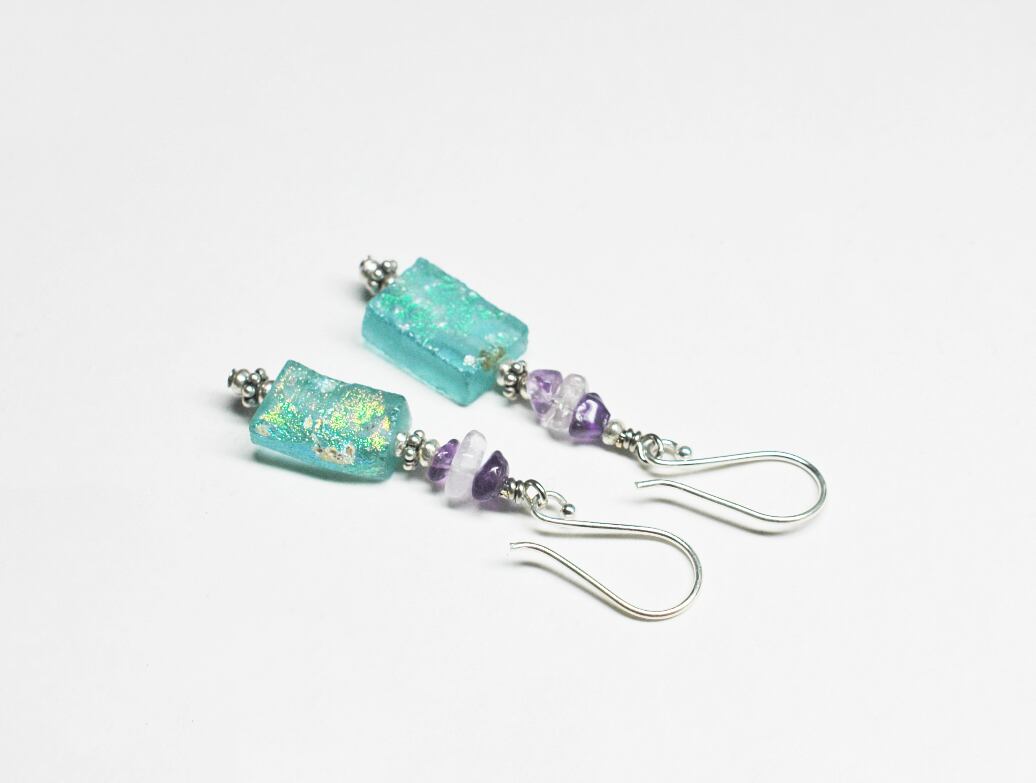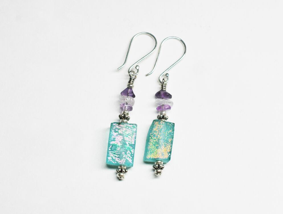 銀化したローマングラスと、さざれ型のアメジストを繋いだピアスです。