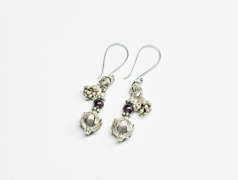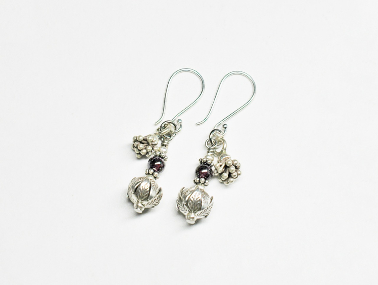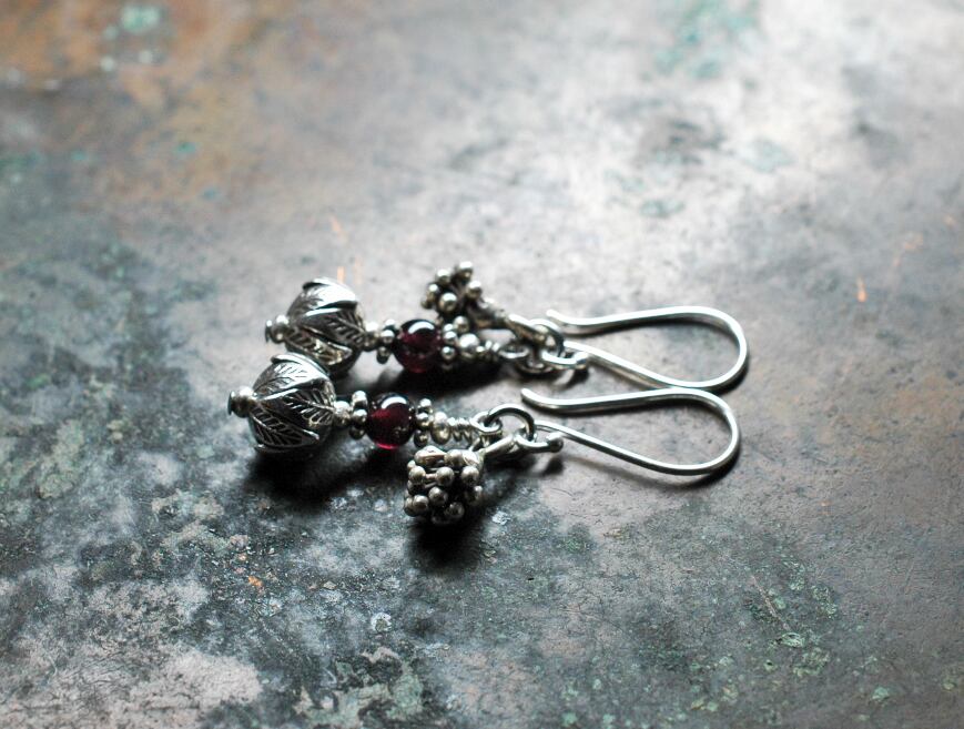 ぷっくりとしたビーズと、蕾チャームのカレンシルバーと、丸いガーネットを繋いだピアスです。
