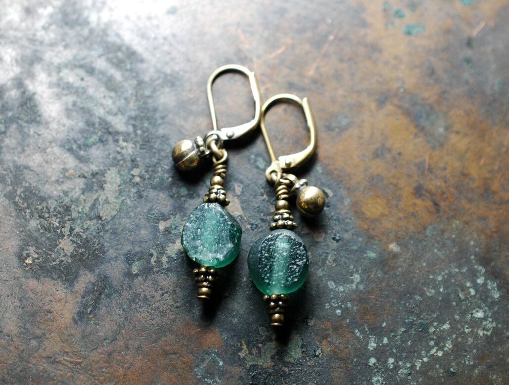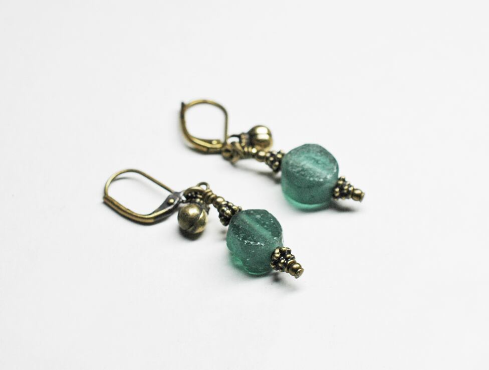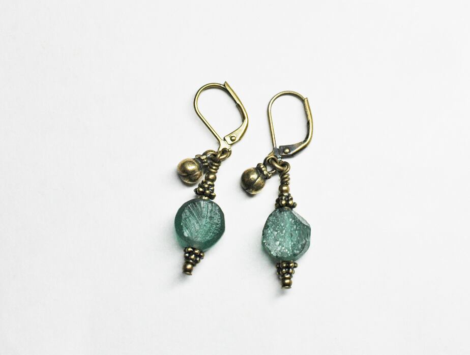 丸いローマングラスと、民族の小さな鈴を繋げたピアスです。