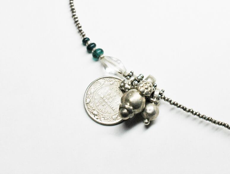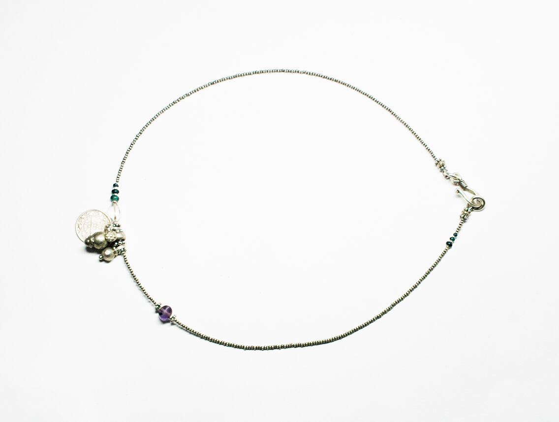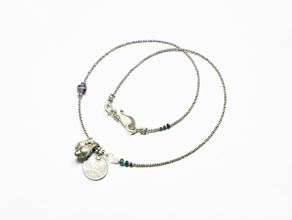 古いインドのコインに鈴のようなパーツを二つ、古代水晶に、古いアメジストなどを繋いだネックレスです。
