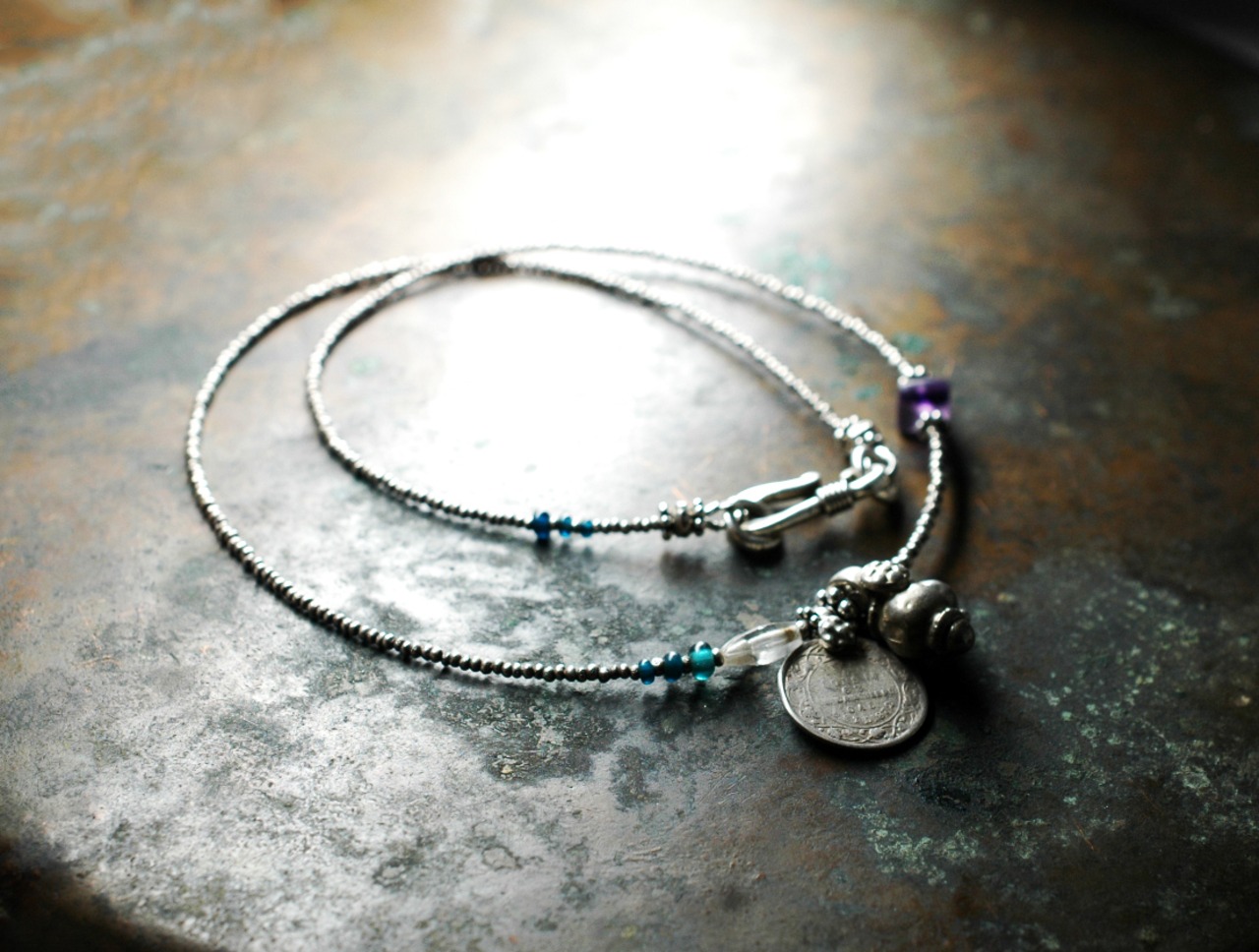 オールドインドシルバーコインと古代水晶、アメジストのネックレス