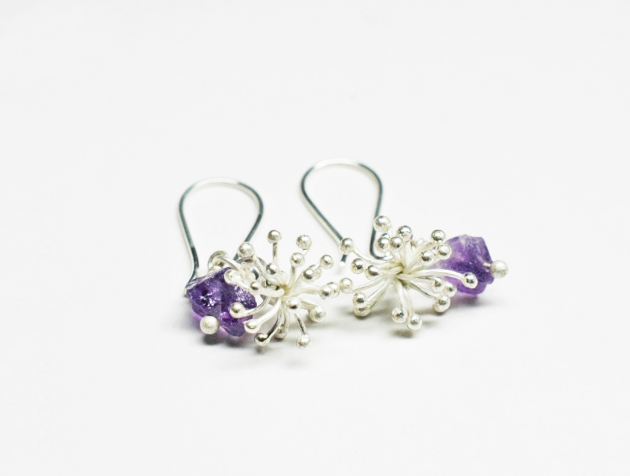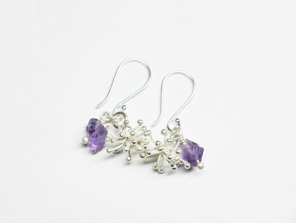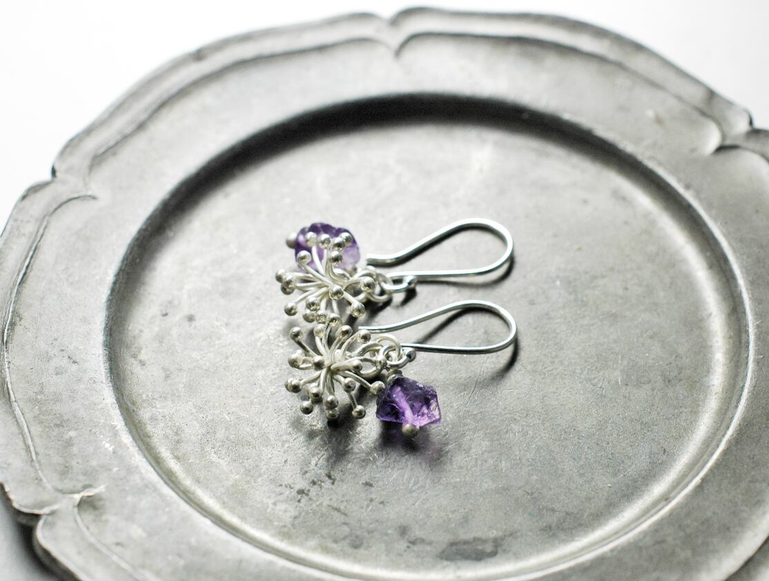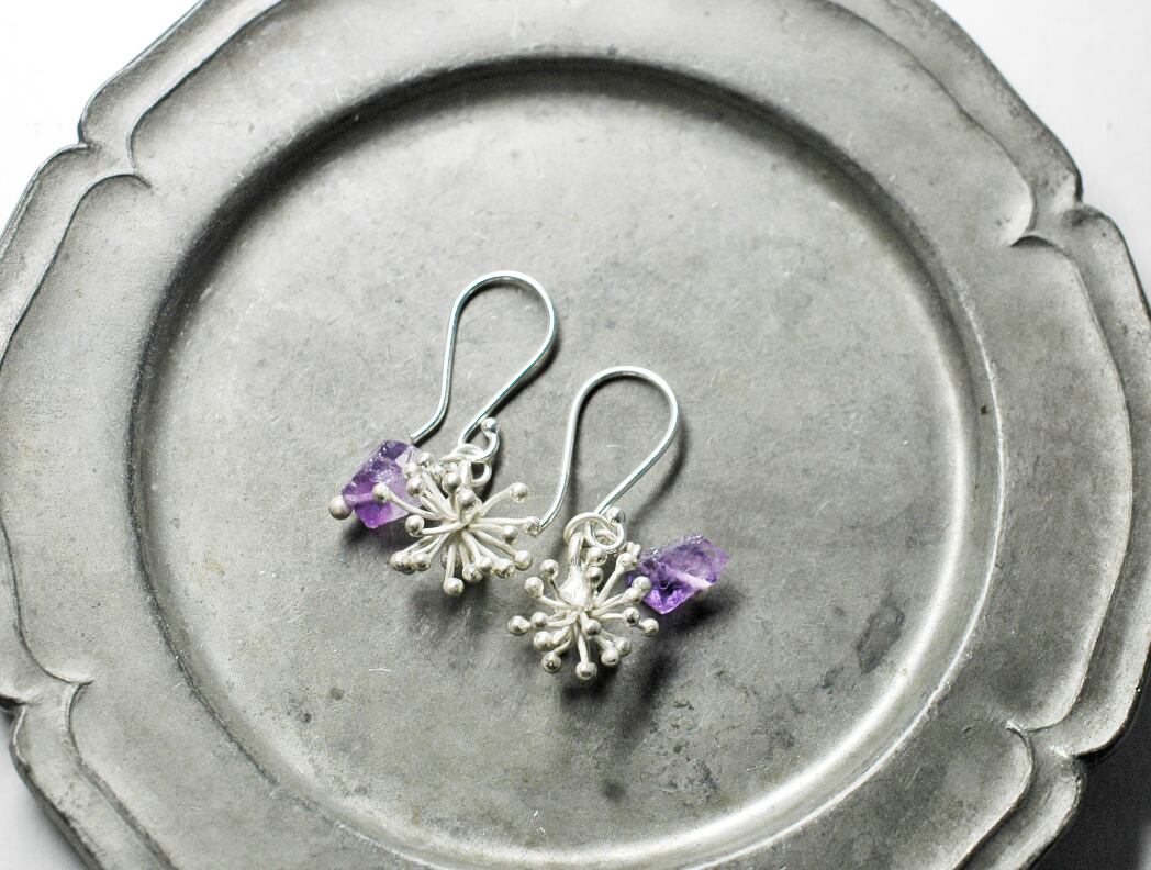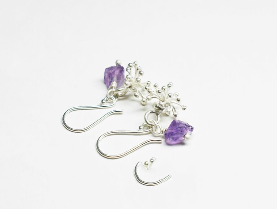雪の結晶のようなパッと開いたカレンシルバーと、ラフロックのアメジストを繋いだピアスです。