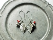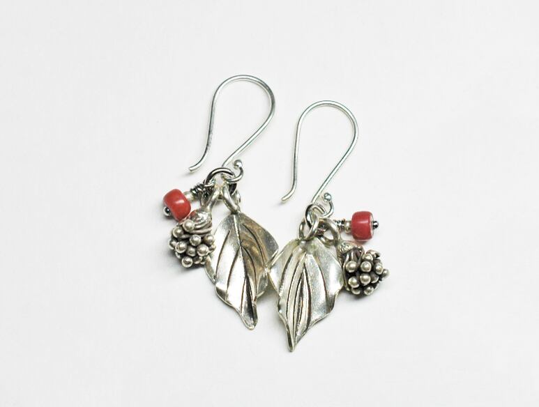 葉っぱと、ツブツブの蕾のようなカレンシルバーと、アンティークビーズを一粒繋いだピアスです。