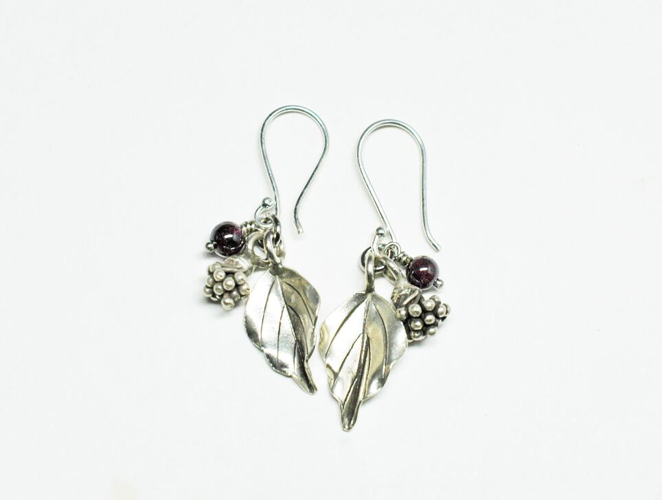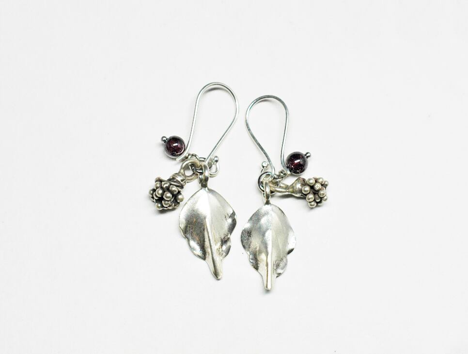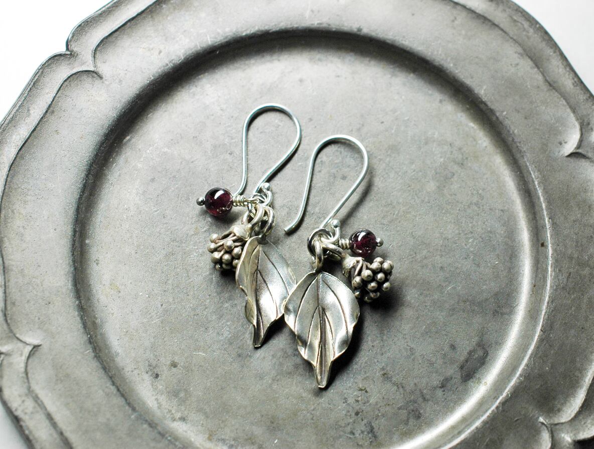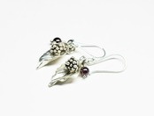 葉っぱと、ツブツブの蕾のようなカレンシルバーと、丸いガーネット一粒繋いだピアスです。
