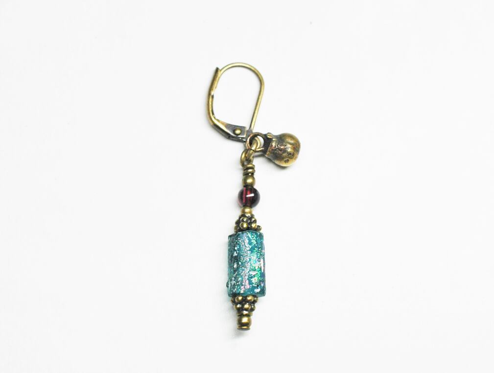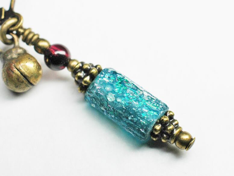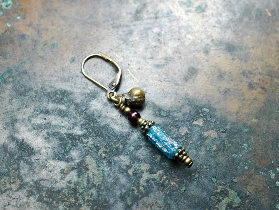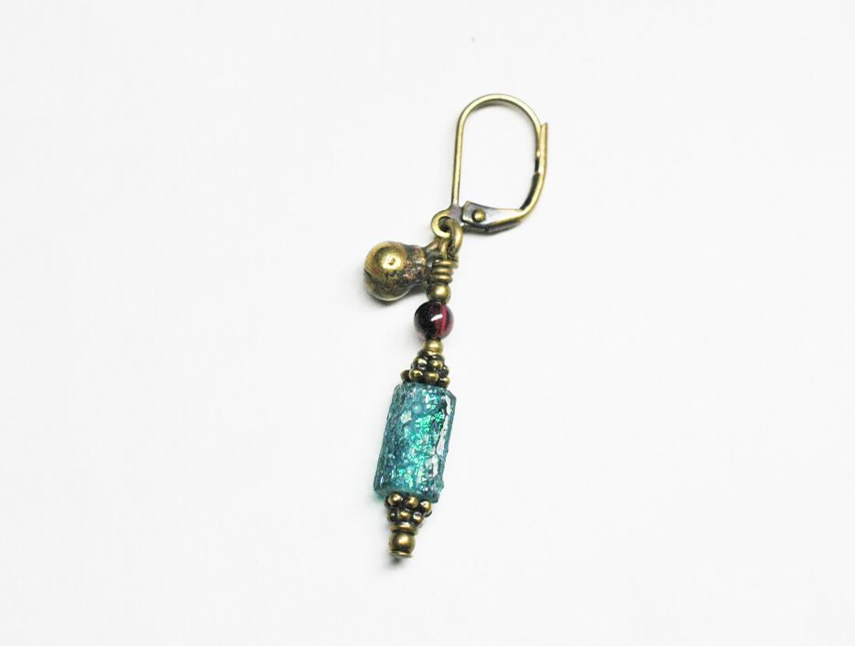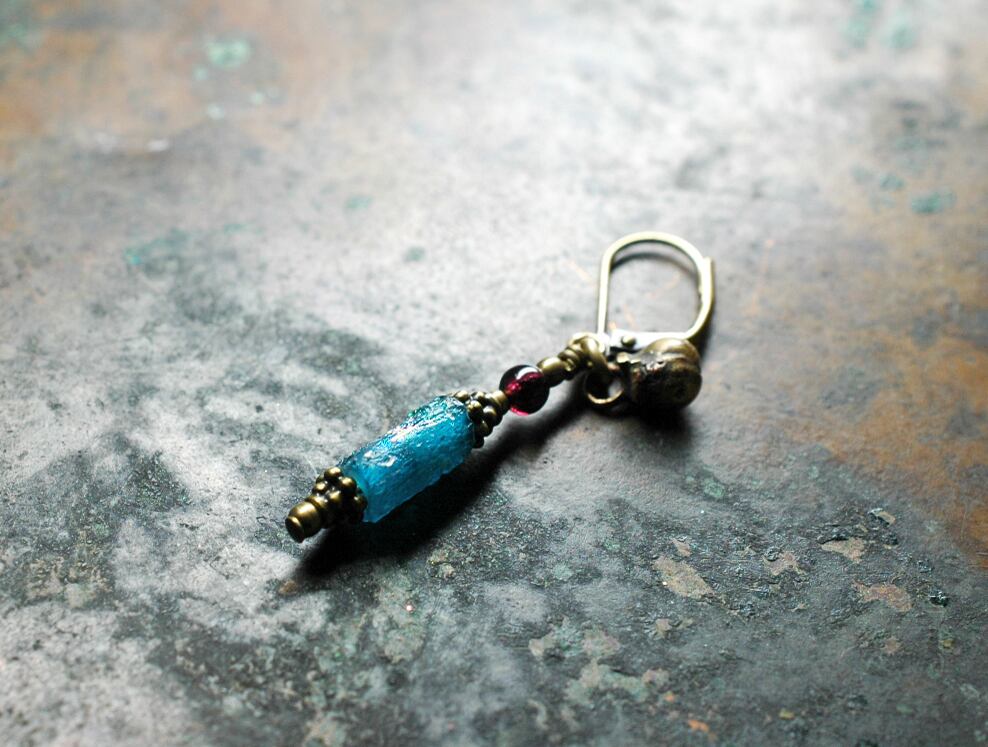 セミクリアブルー色の小さめなローマングラスをと、ガーネット、民族鈴を繋いだ片耳ピアスです。