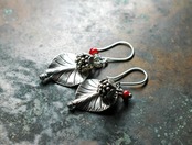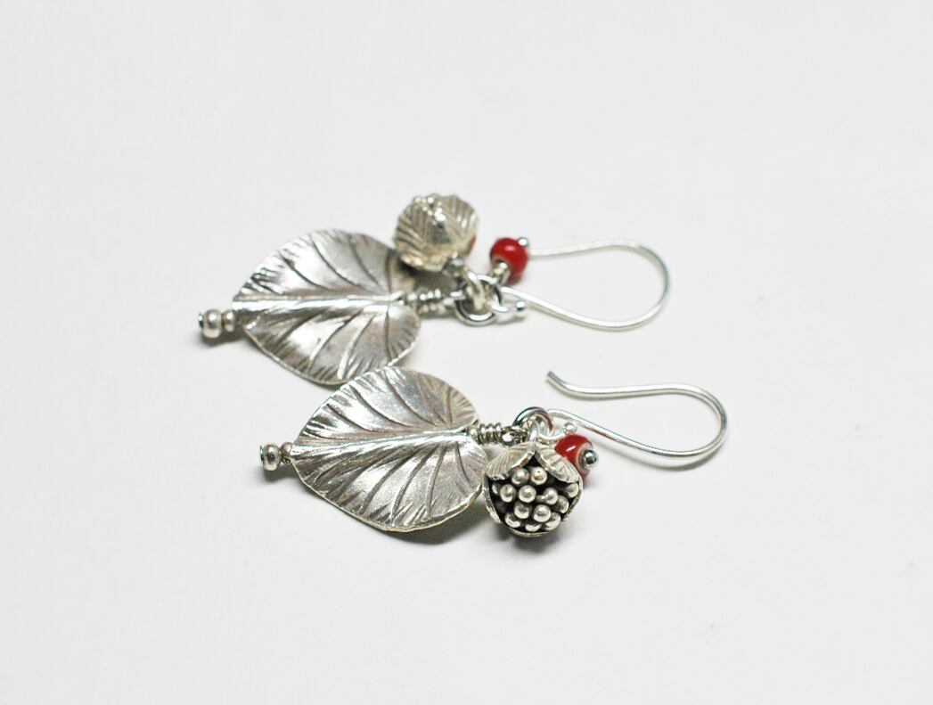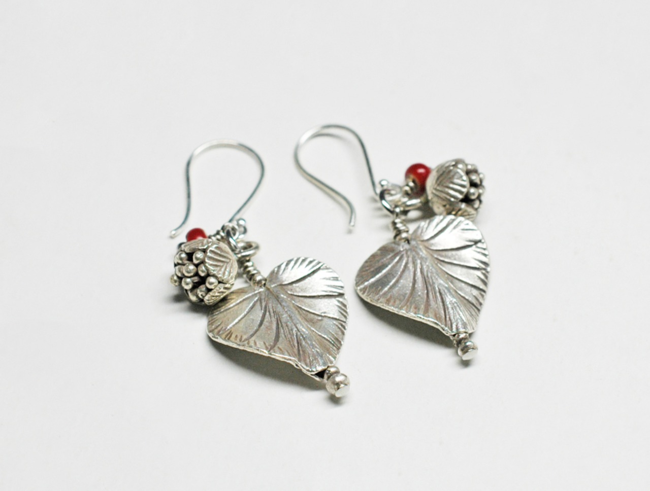 葉っぱと、コロンとしたお花のカレンシルバーと、赤いアンティークビーズを一粒繋いだピアスです。