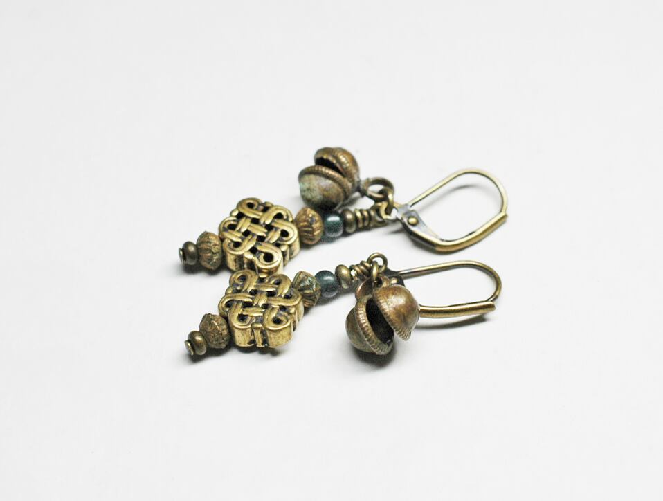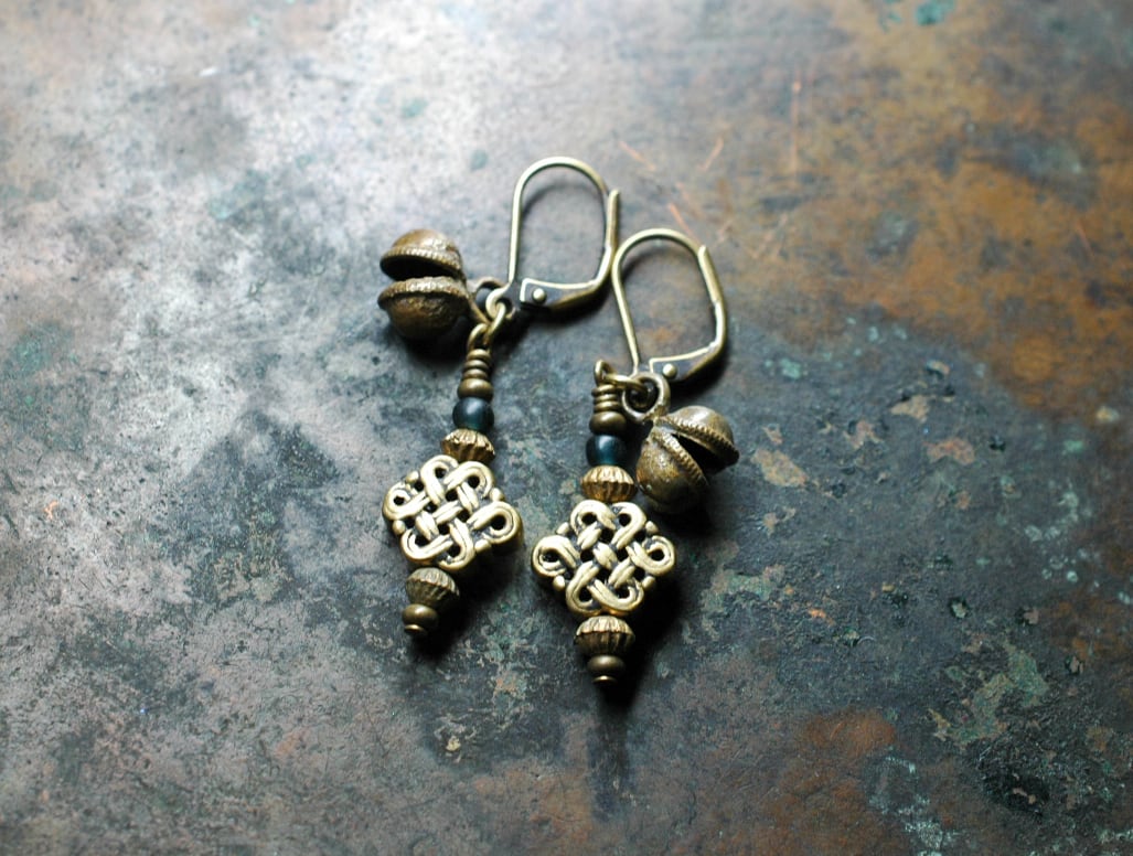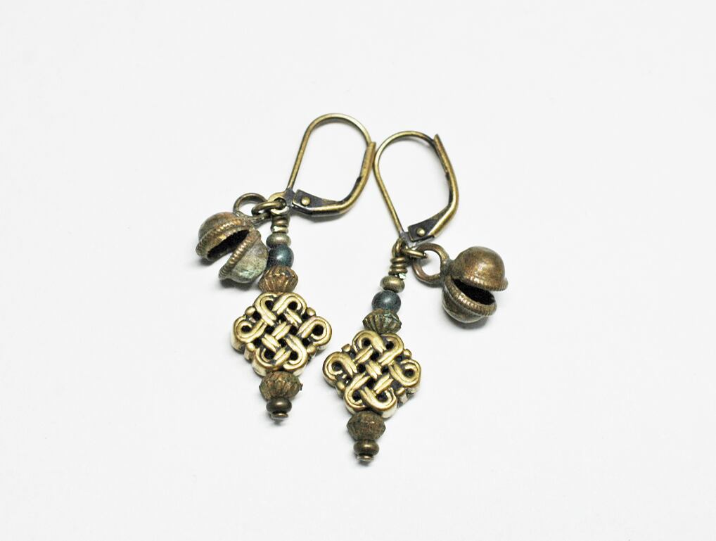 真鍮製のエンドレスノットと、ベル型のトライバルを繋げたピアスです。