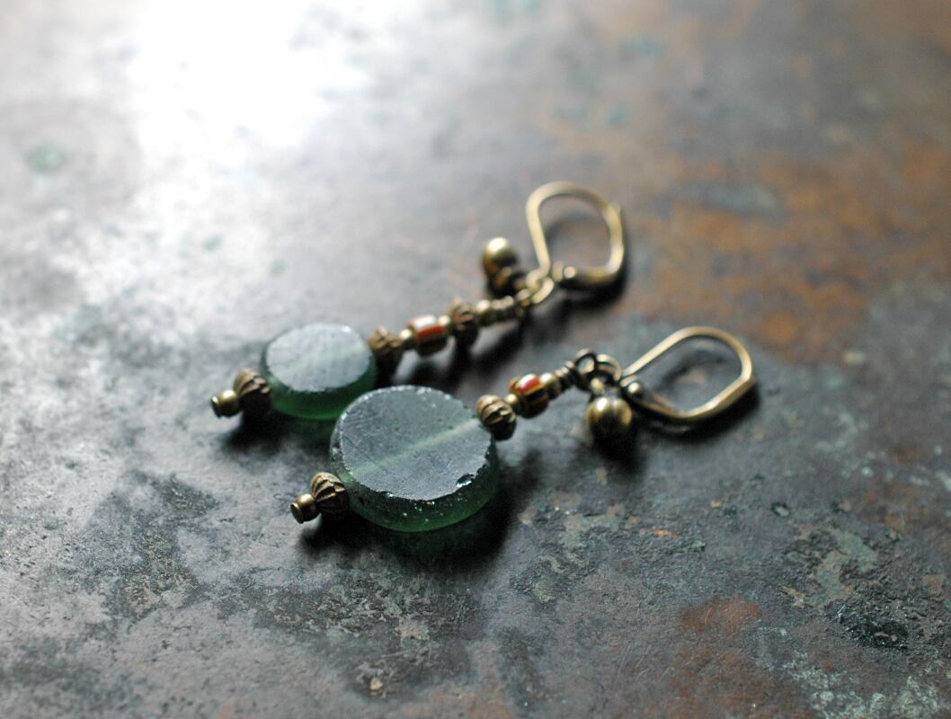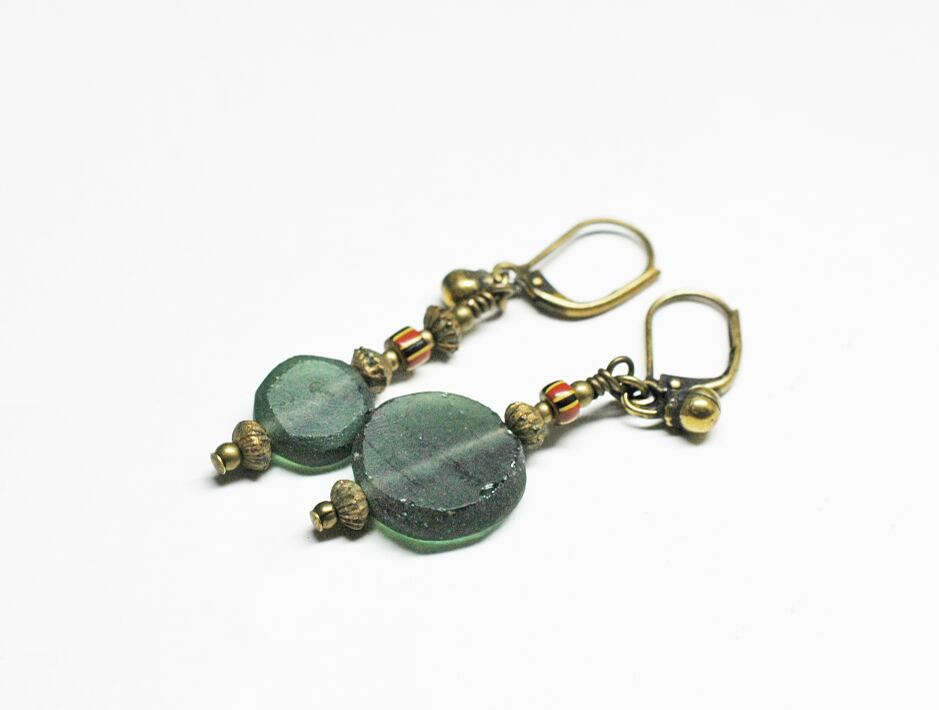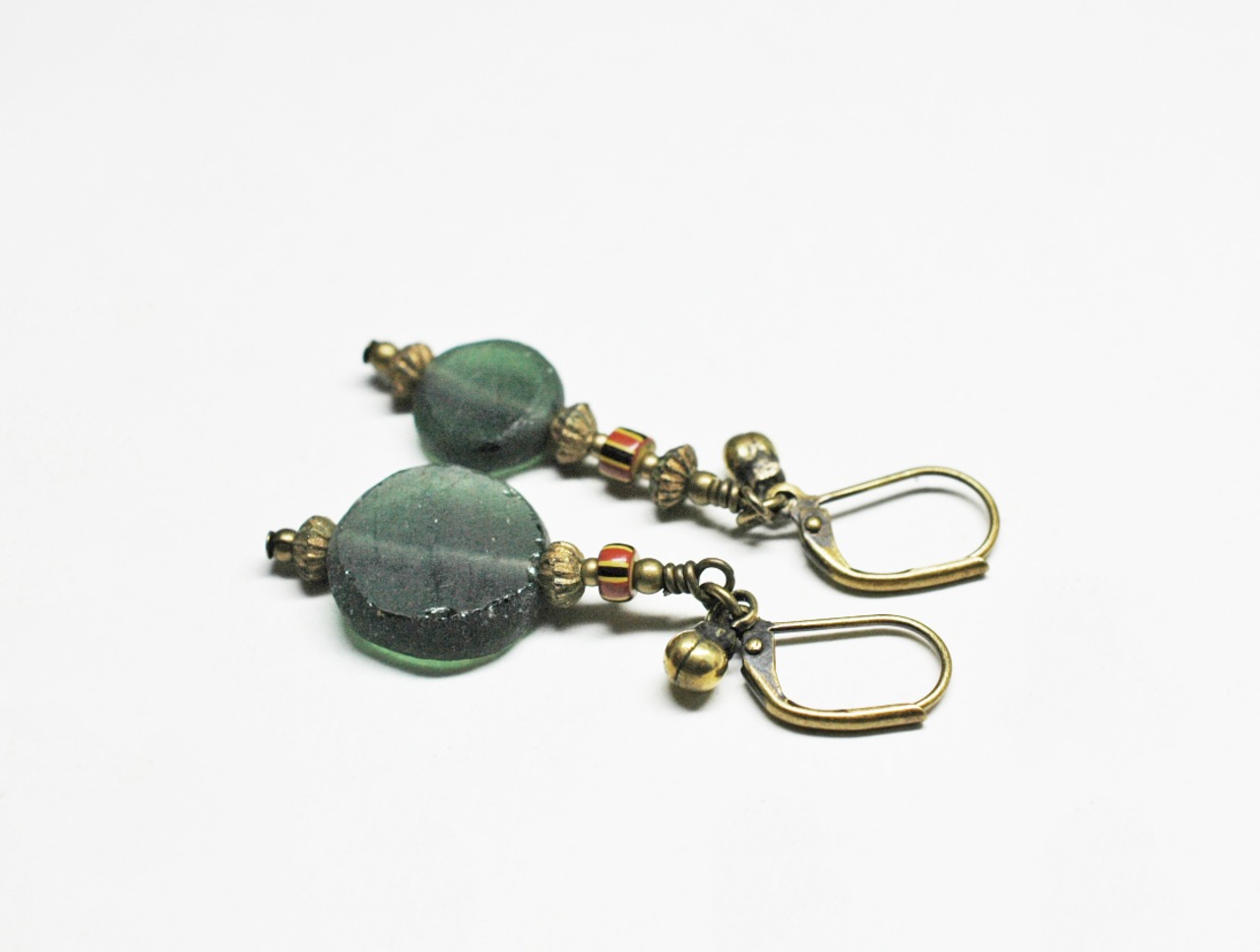 丸いローマングラスと、ストライプのアンティークビーズ、民族の小さな鈴を繋げたピアスです。