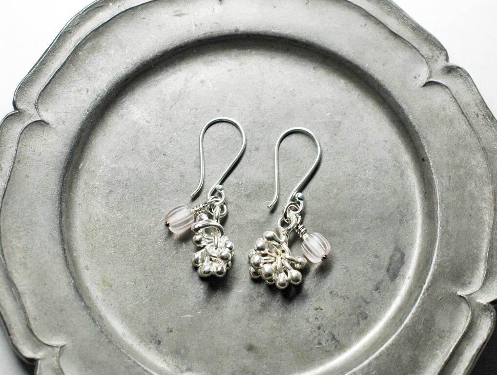 ツブツブが集まったようなカレンシルバーチャームと、グーズベリーを繋いだピアスです。